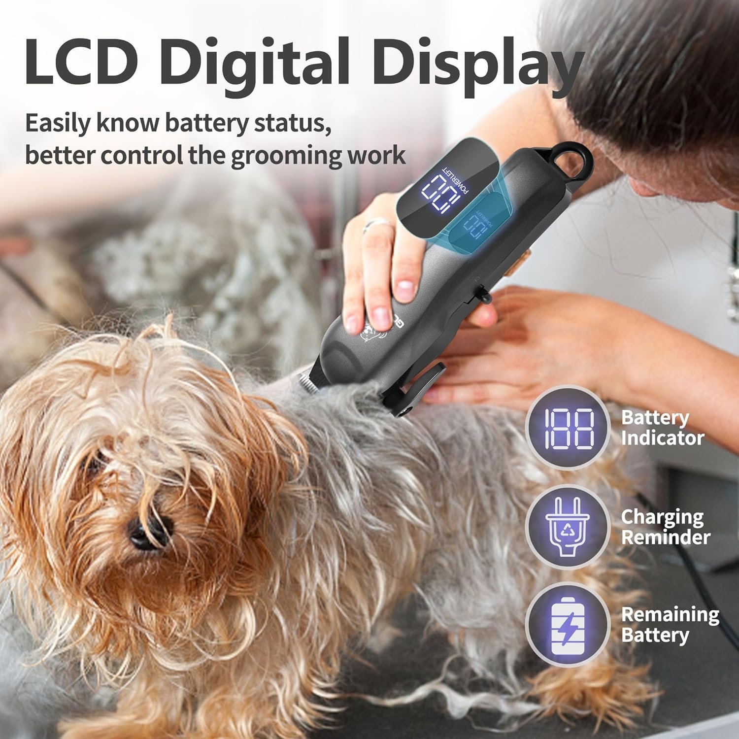 【Long Lasting Battery & LCD display】: 2000mA High Capacity Li-ion Battery, charging for 3 hours and can sustain use of 240 minutes. With LCD display,for reminding using and charging status,helping you better control the grooming work. Rechargeable design of this dog clipper, you don’t have to buy replace batteries.