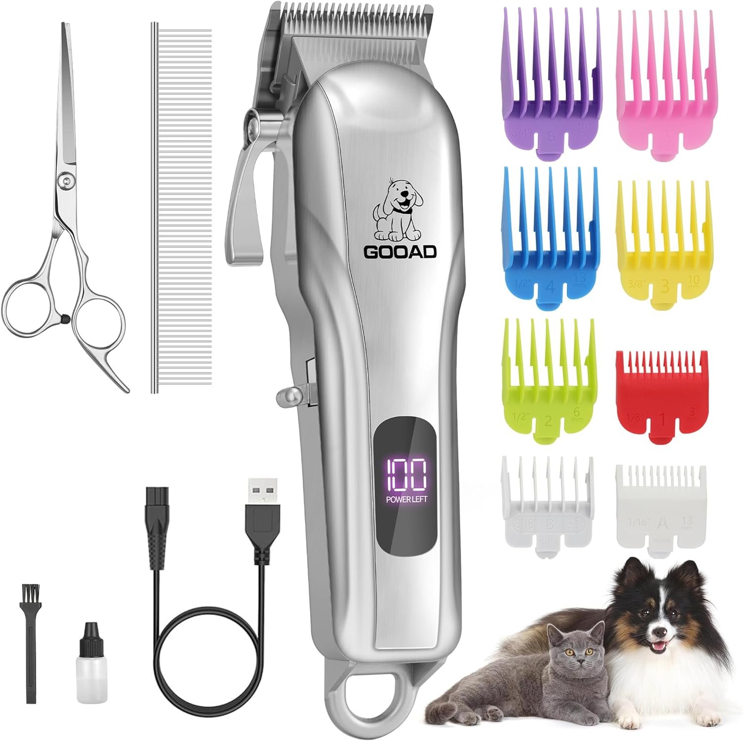 【Complete Kit for Pet Grooming】: 8 limit comb , 1 pet steel comb , 1 type a cutter head , 1 charger , 1 pet hair clipper , 1 cleaning brush , 1 scissors , 1 toolkit , 1 manual .We Have All The Tools Needed For Dog Grooming.
