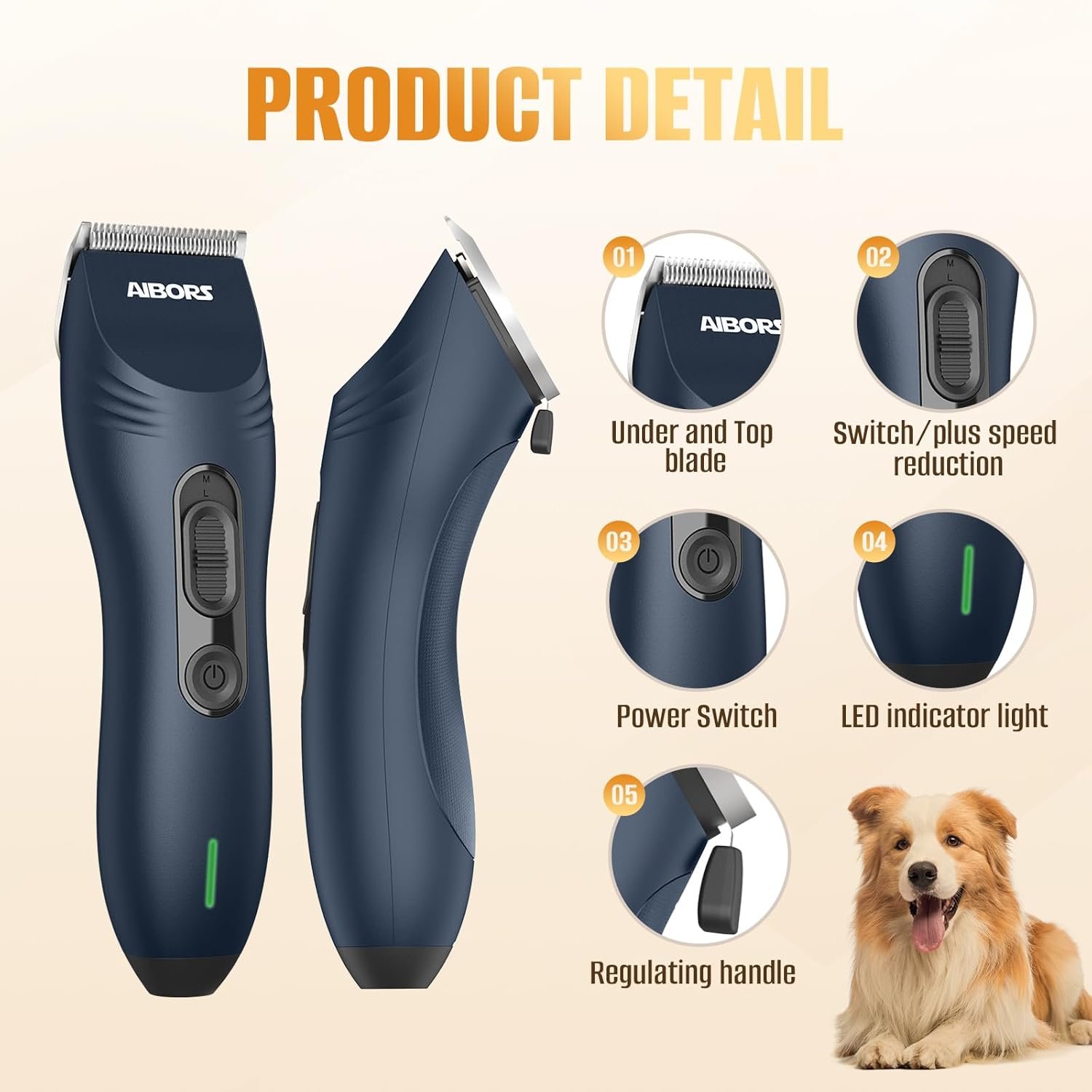 【Long battery life and rechargeable】A 3-hour charge provides 3-4 hours of use. AIBORS dog hair trimmer is designed with a rechargeable battery, so you never have to worry about buying replacement batteries