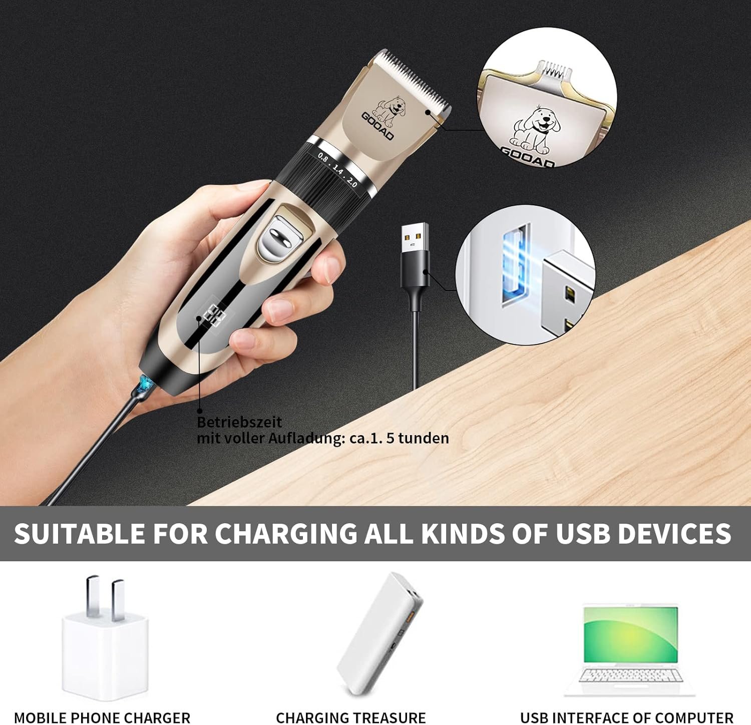 Long Lasting Battery & LED Indication: USB charging design .2200mA High Capacity Li-ion Battery, charging for 3 hours and can sustain use of 250 minutes.With LCD display,for reminding using and charging status,helping you better control the grooming work.Rechargeable design of this dog clipper, you don’t have to buy replace batteries. Long-term use does not cause wrist pressure or pain