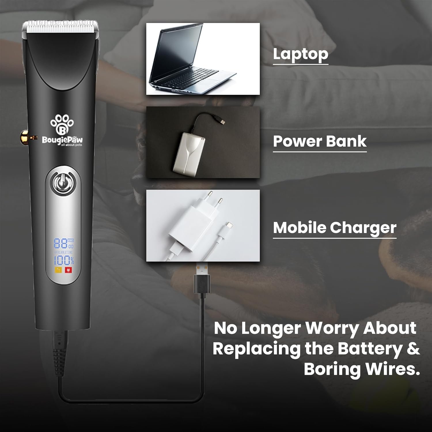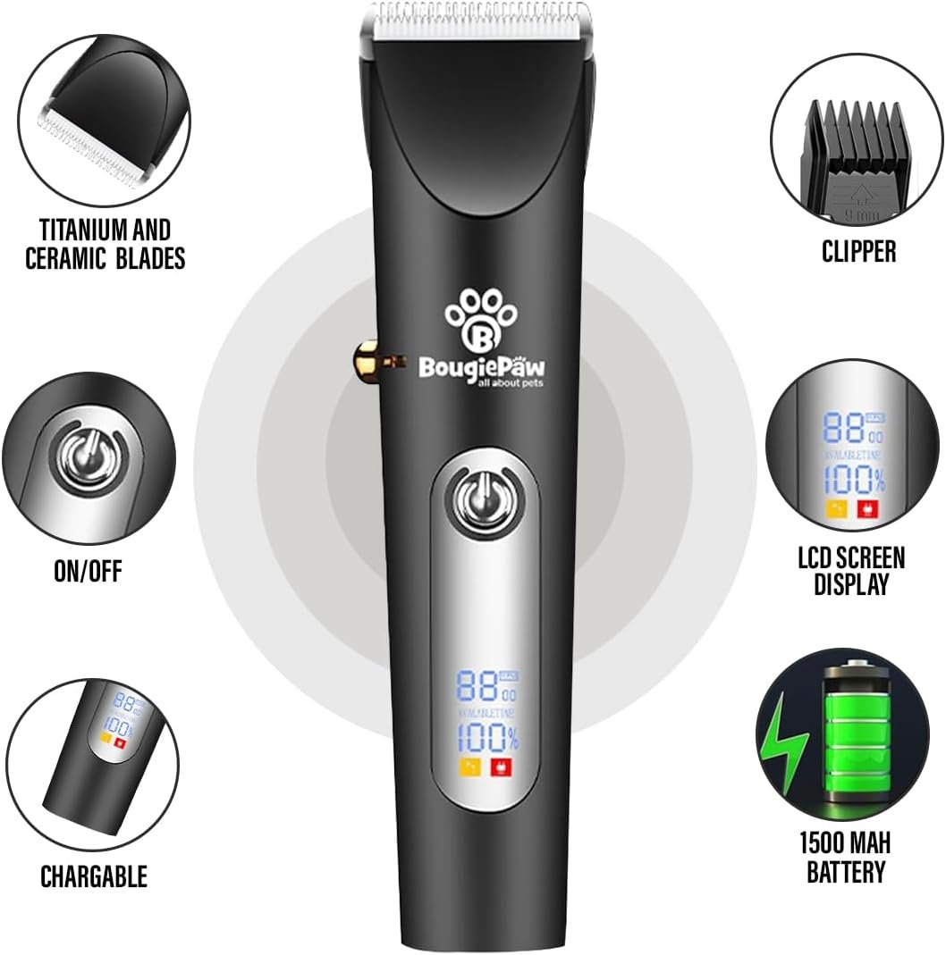 Now it’s time for the main grooming! Use the BougiePaw cordless clippers to trim your dog’s fur to the desired length. Work carefully and patiently, so your pet can enjoy a smooth and stress-free grooming session.