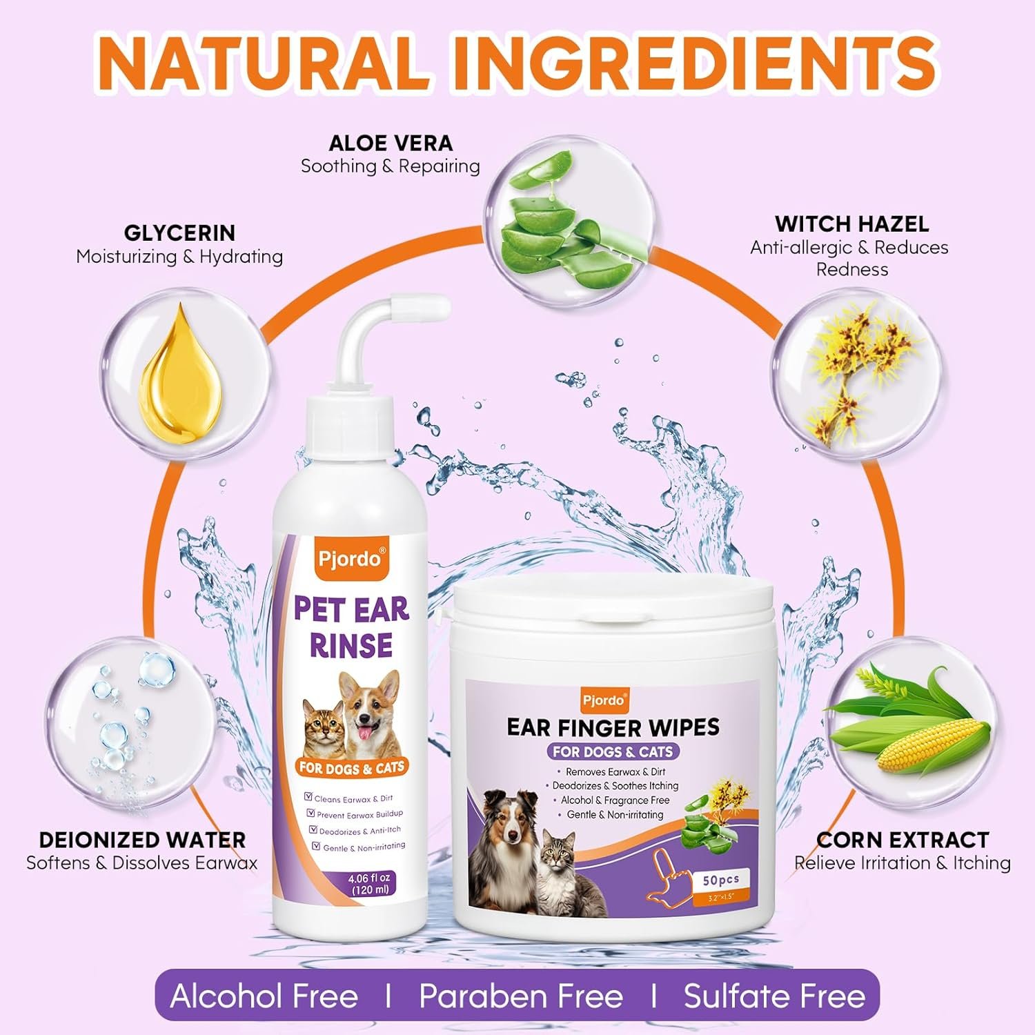 Natural Ingredients: Cat ear wipes and ear cleaner drops contain natural plant extracts such as aloe vera and witch hazel, alcohol and paraben free, gentle and non-irritating to your pet’s ears, providing your pet with safe and comfortable ear cleaning care, preventing various ear problems caused by earwax buildup, and keeping cats and dogs fresh and healthy all the time!
