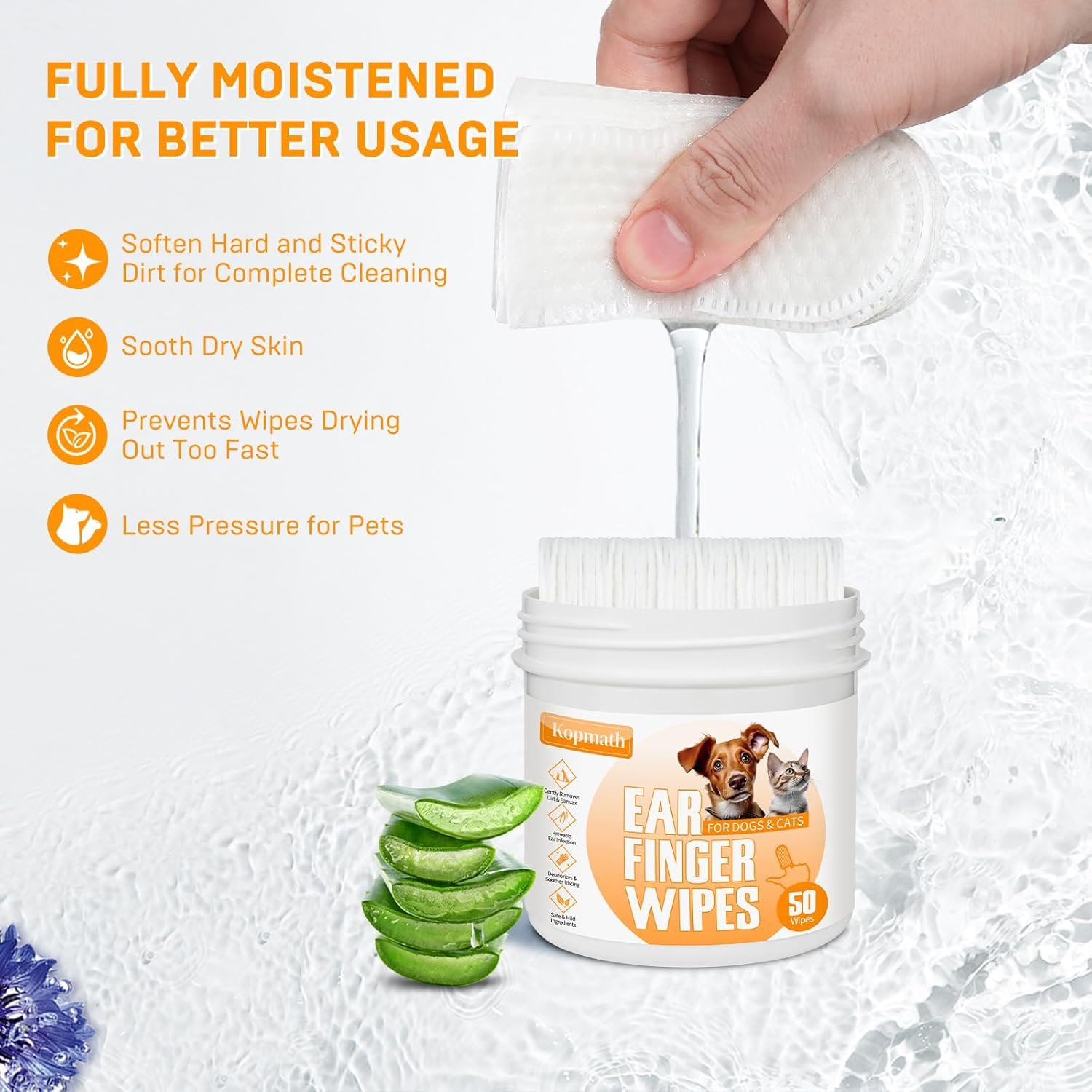 Dog Ear Wipes, Ear Cleaner Finger Wipes for Dogs & Cats, Gently Remove Earwax & Odor, Soothe Ear Itching and Infection, Easy to Use, Natural Cat Ear Wipes for Dogs, 50 Disposable Count