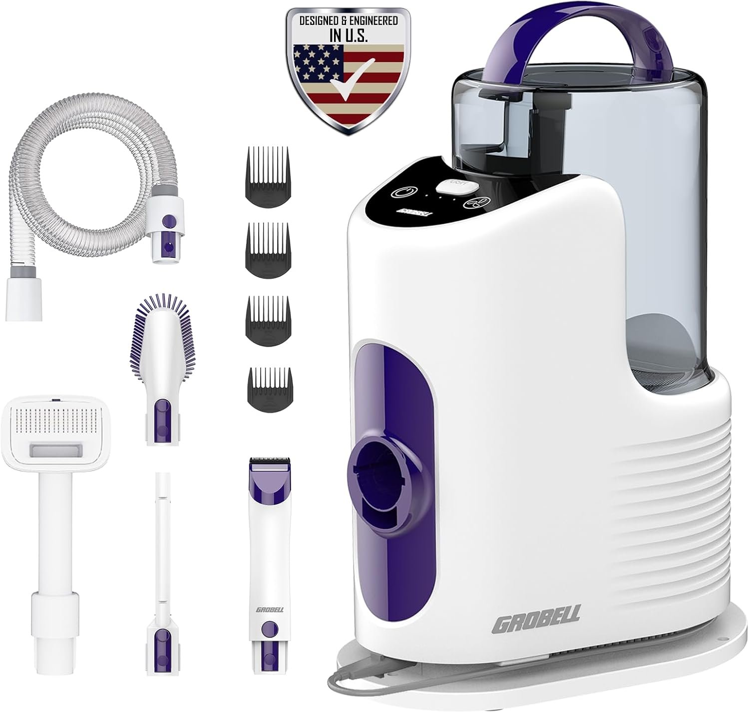 [GROBELL Professional Pet Grooming Vacuum Kit]: Featuring a 2.5L capacity, this kit is suitable for long, short, thick, or curly pet hair. With a 3-level suction adjustment, the minimum noise level remains below 55 dB. Accessories: Electric hair clipper, Grooming brush, De-shedding brush, Cleaning brush, and Vacuum head. Suitable for dogs, cats, and other animals, it offers a comprehensive solution to pet grooming. Experience cost savings by taking care of your pets’ grooming needs at home.