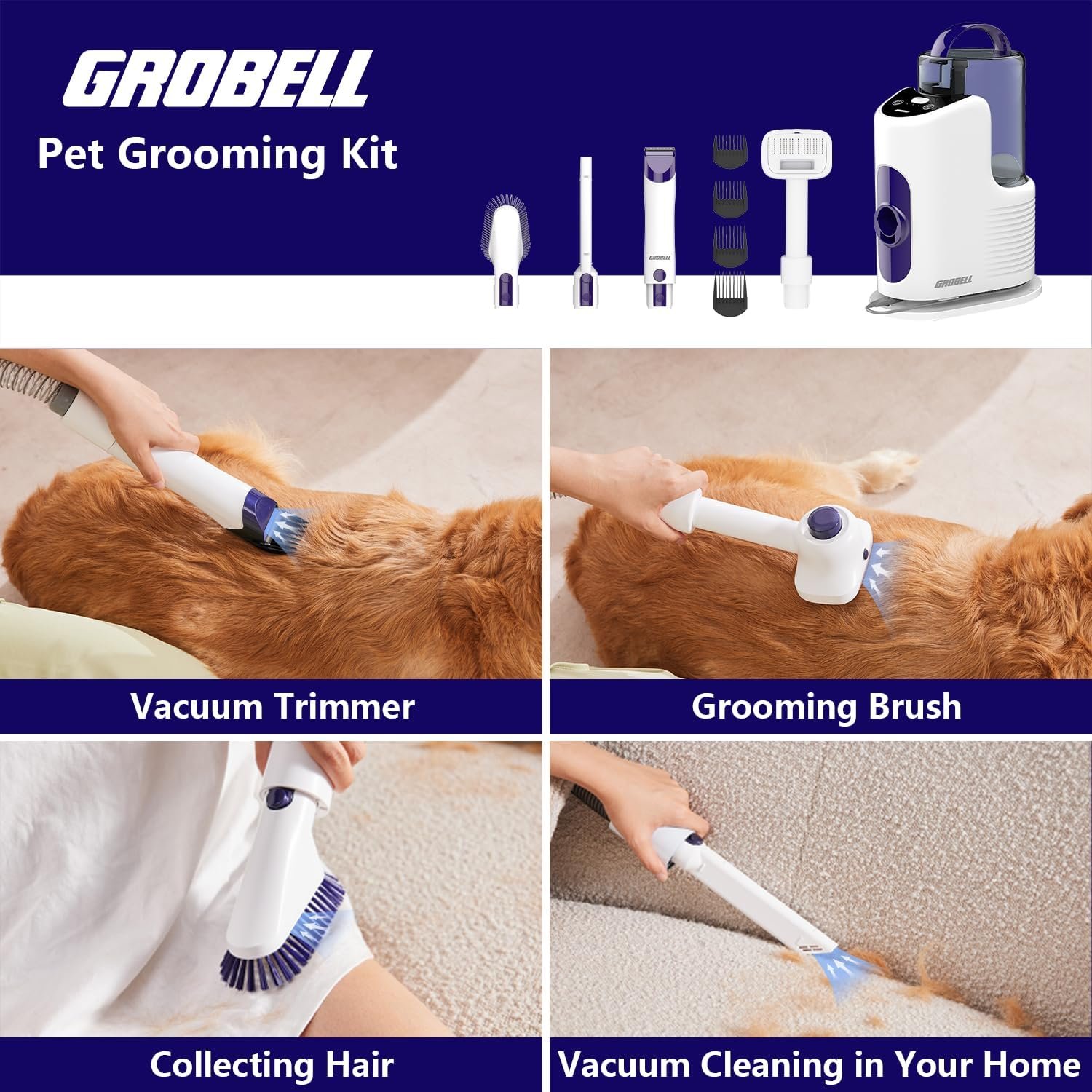 [Multi-Purpose]: The GROBELL Pet Grooming Kit combines vacuum cleaning capabilities with pet grooming functionalities, allowing you to groom dogs, cats, rabbits, and other animals, saving you the expense of regular trips to the grooming salon. Additionally, it can be used as a corded vacuum cleaner to help you clean your home, including dog pads, pet beds, grooming tables, as well as furniture, sofas, crevices, plush toys, small area carpets, and the hair that accumulates on floors, and more.