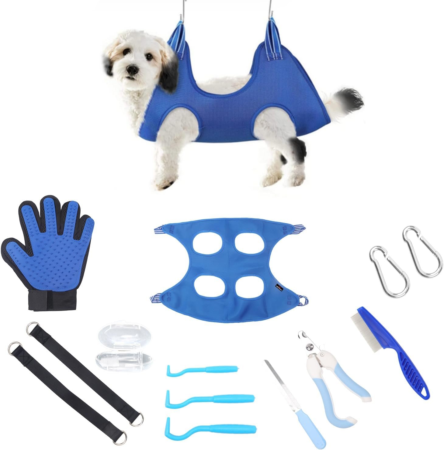 [9-in-1 Puppy Grooming Kit]: This pet grooming hammock comes complete with 9 essential grooming tools including grooming hammock for dogs, brush, comb, 2x carabiners, 2x Strong Handle straps, 2x Steel Hooks for hanging, Grooming glove, nail cutter for cats and dogs and filer providing all-in-one convenience.
