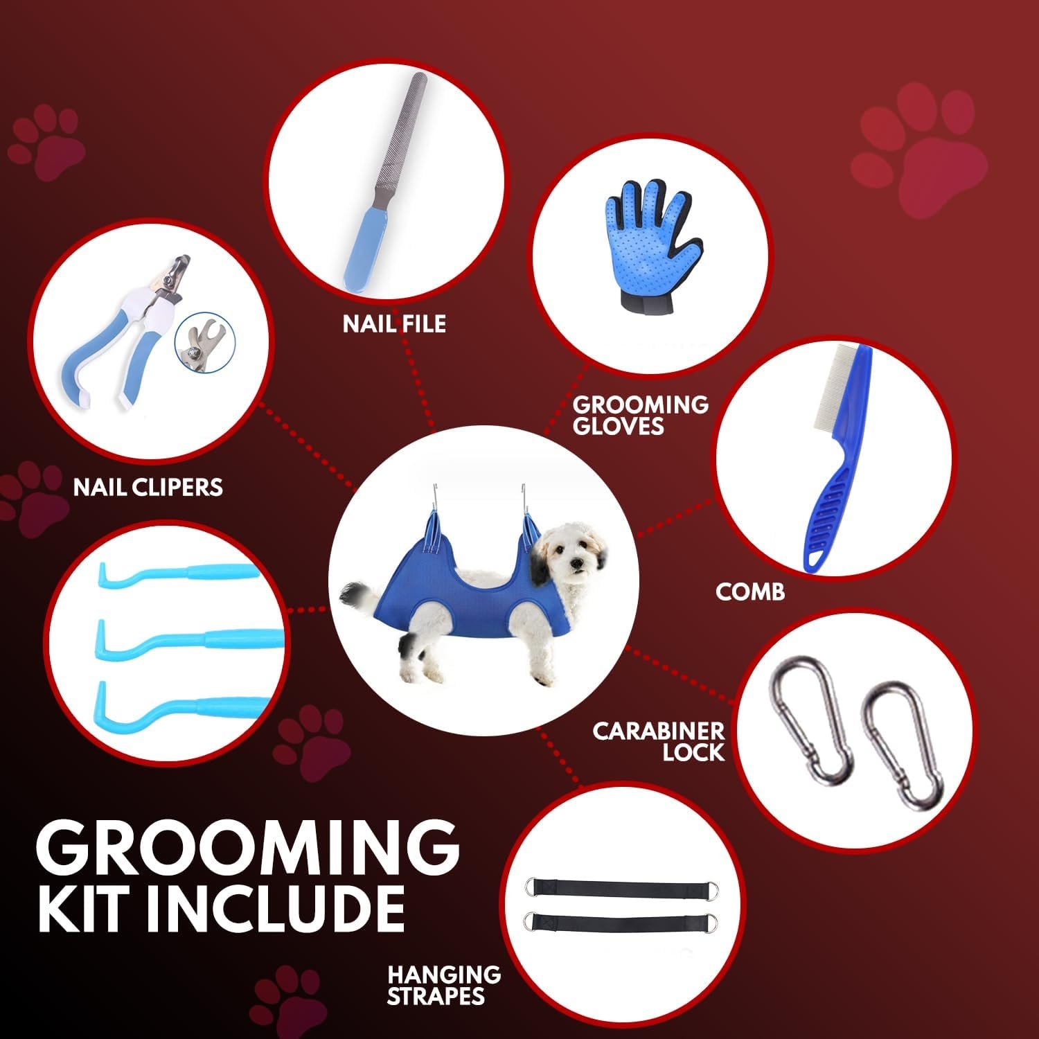 [9-in-1 Puppy Grooming Kit]: This pet grooming hammock comes complete with 9 essential grooming tools including grooming hammock for dogs, brush, comb, 2x carabiners, 2x Strong Handle straps, 2x Steel Hooks for hanging, Grooming glove, nail cutter for cats and dogs and filer providing all-in-one convenience.