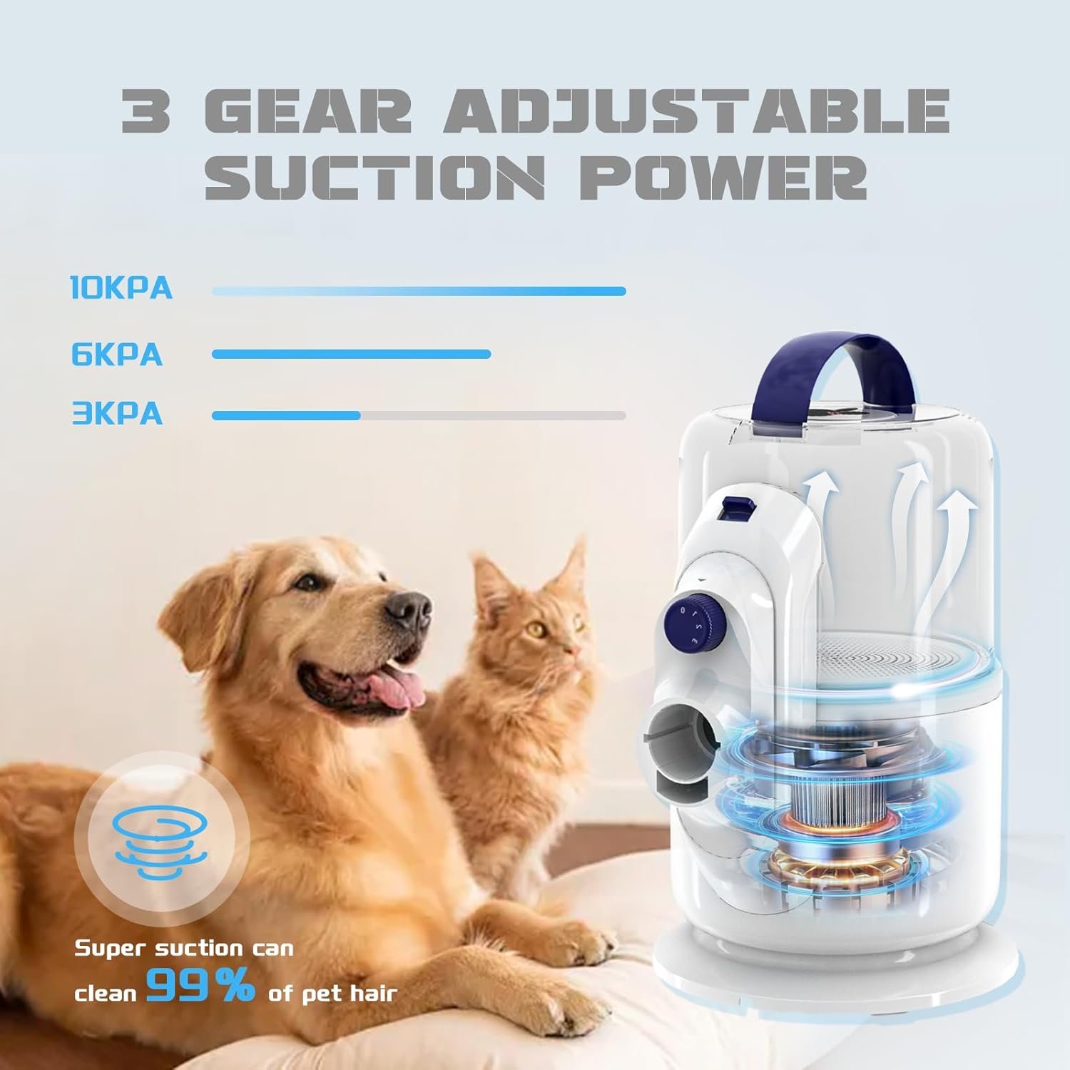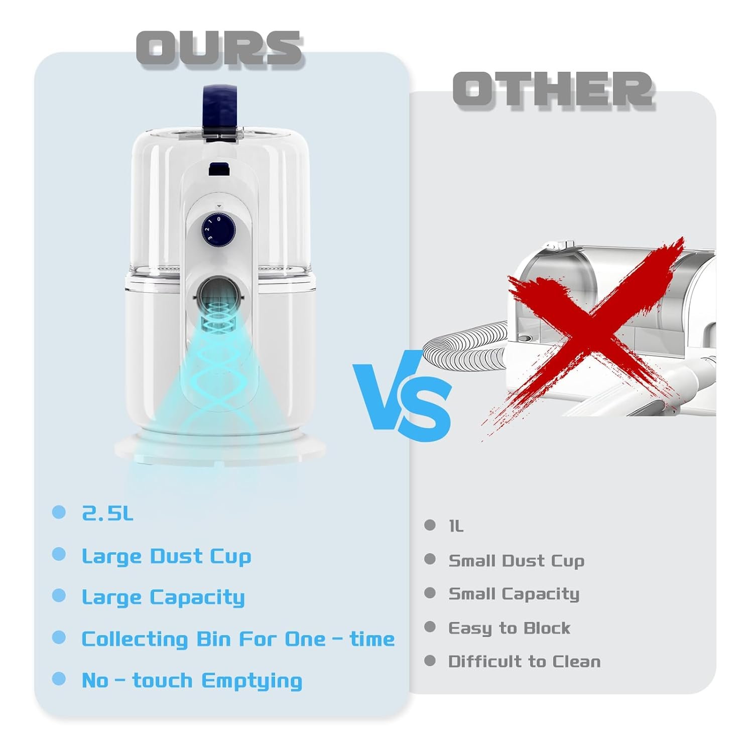 【2.5L Large Dust Cup】Our pet grooming set is equipped with a 2.5L large-capacity detachable dust cup, which can meet the rough storage of hair for multiple puppies or one large dog, allowing pet grooming to be completed in one go without any interruptions. At the same time, our pet hair vacuum cleaner is equipped with double filtration, which can effectively prevent hair from entering the inside of the machine and affecting the service life of the machine.