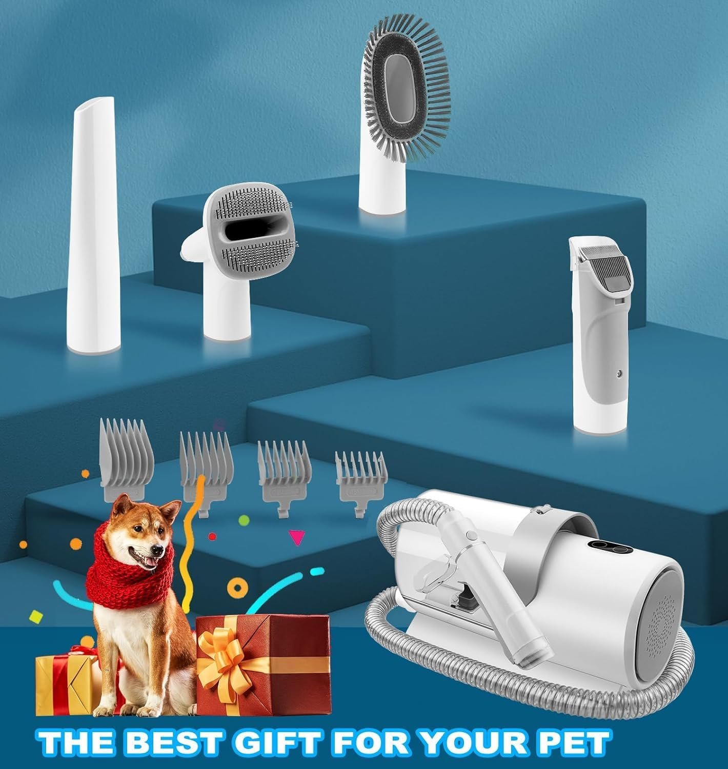 Transform grooming your furry friend into a stress-free experience with our comprehensive Dog Grooming Kit. This all-inclusive set includes everything you need for efficient and gentle grooming at home. **Key Features:** 1. **4 Hair Clipper Combs:** Easily adjust hair length with precision using our four clipper combs, ensuring a tailored grooming session suitable for various coat types and lengths. 2. **2.5L Vacuum Cleaner:** Maintain a clean environment effortlessly with the integrated vacuum cleaner, designed to suck up loose hair and minimize mess during grooming sessions. 3. **5 Pet Grooming Tools for Shedding:** Tackle shedding effectively with our assortment of grooming tools, specifically crafted to remove loose fur and keep your pet’s coat healthy and shiny. 4. **Low Noise Operation:** Keep your pet calm and comfortable with our grooming tools that operate quietly, minimizing anxiety during grooming and ensuring a pleasant experience for both you and your pet. Ideal for all dog breeds and coat types, our Dog Grooming Kit combines functionality with ease of use, making it a must-have for pet owners who prioritize their pet’s grooming and cleanliness.