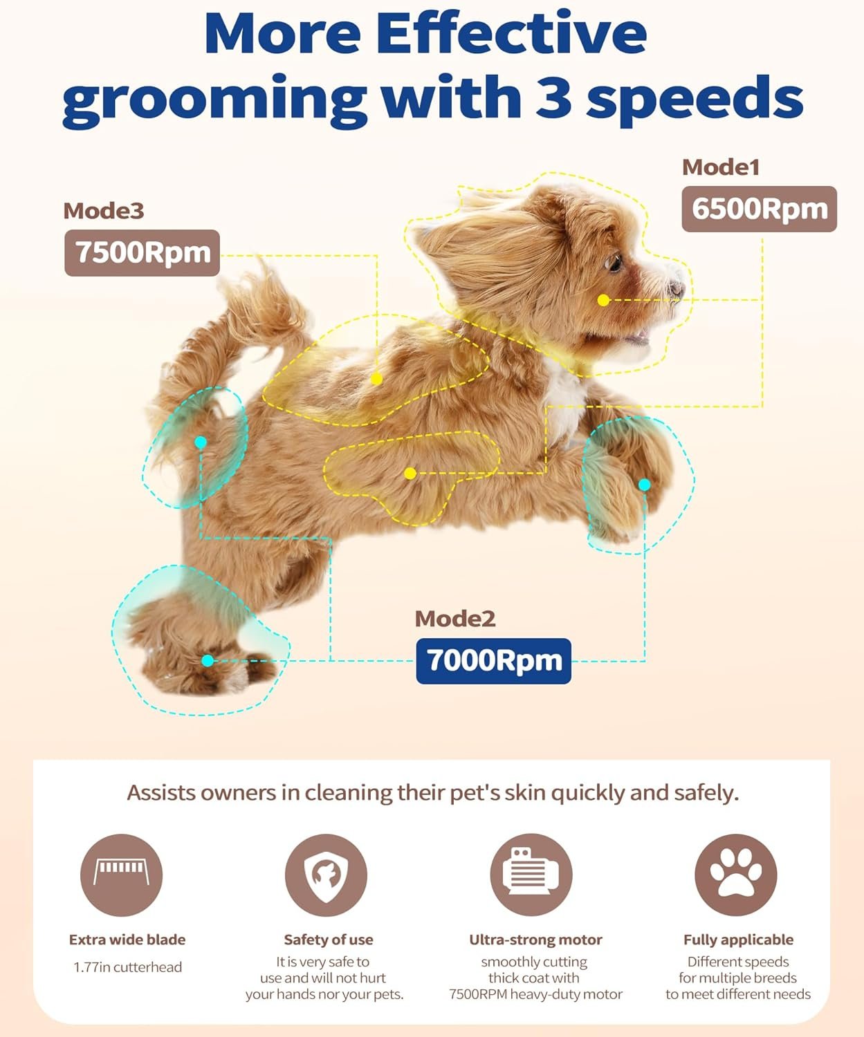 [Large capacity battery and 3 speed adjustments] 2500 mA long battery life and a powerful 6500-7500 rpm motor adapt to a wide range of hair needs, pet grooming kit allows you to trim professionally at home