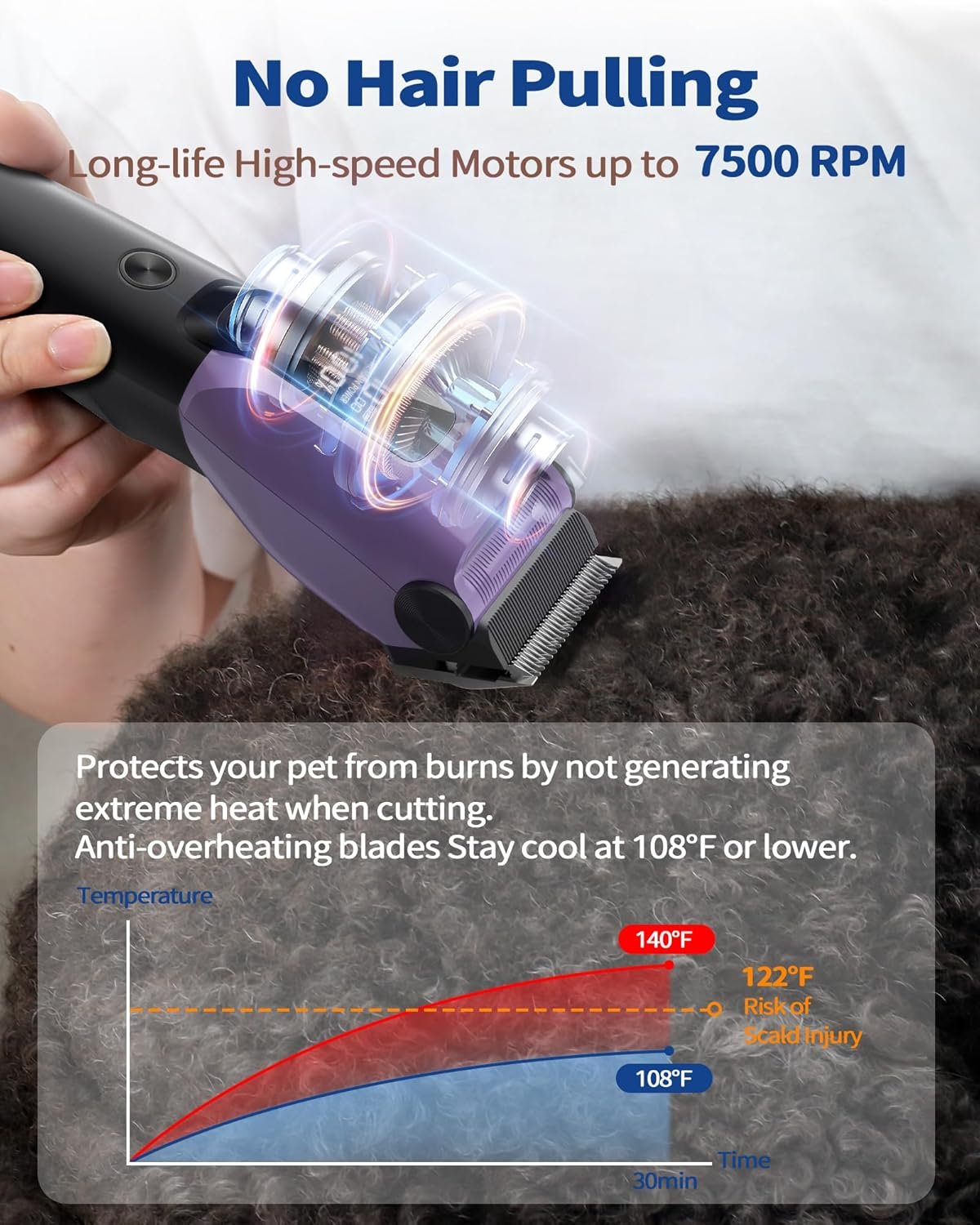 [Low Noise & Low Vibration] Our quiet dog hair clippers make less than 55 dB of noise to keep your pet calm and relaxed, making grooming easy for both you and your furry friend.If your pet is very sensitive and timid, you can turn the dog shears on in advance around your pet and wait for your pet to get used to them before trimming them