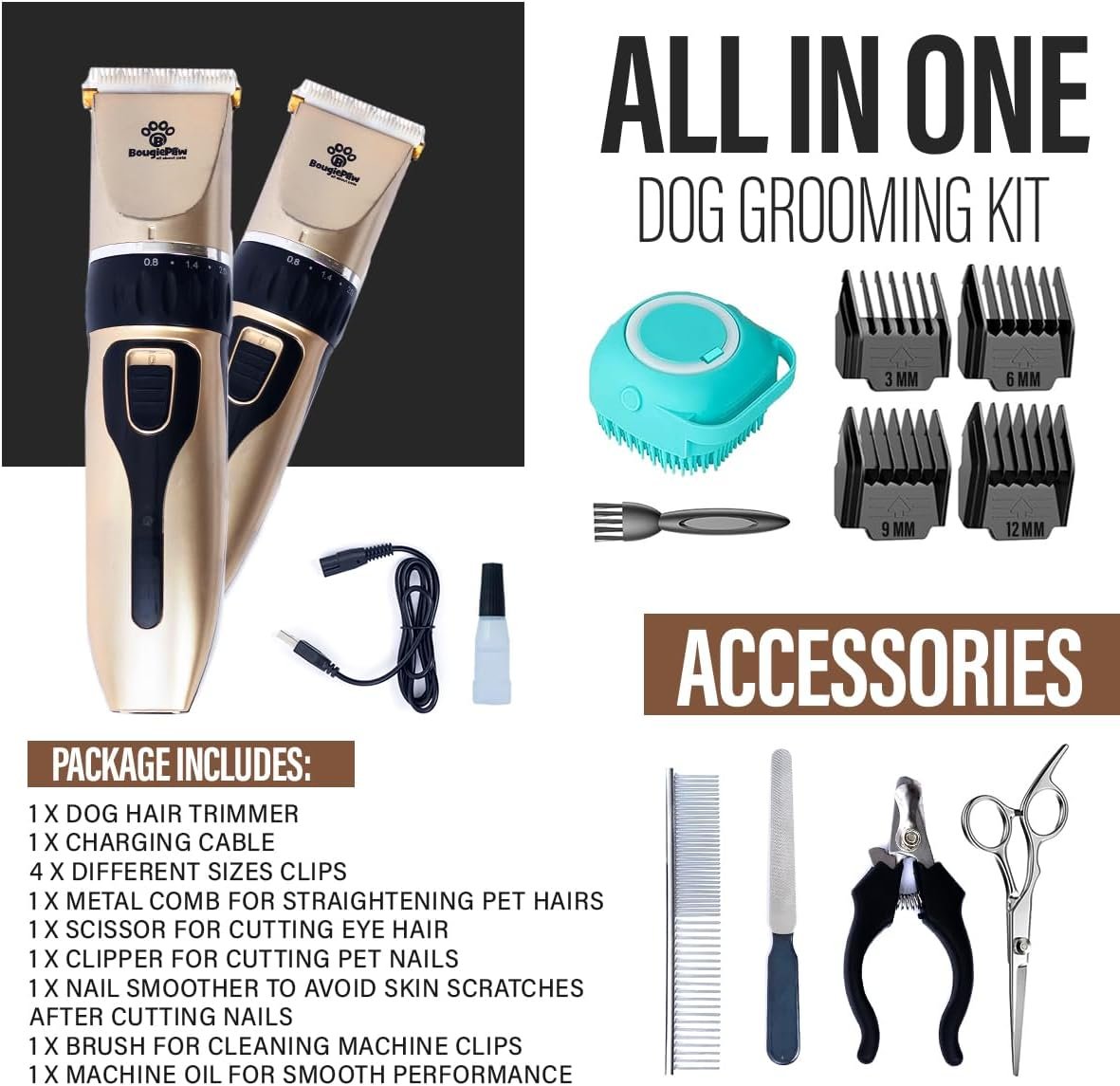 [𝐀𝐋𝐋-𝐈𝐍-𝐎𝐍𝐄] BougiePaw professional dog razors grooming kit includes rechargeable dog paw trimmer for long and matted hair with built-in high performance battery, 4 guard combs for different hair lengths, clippers and scissor for dog nails, and shampoo brush for dog bath before hair clipping