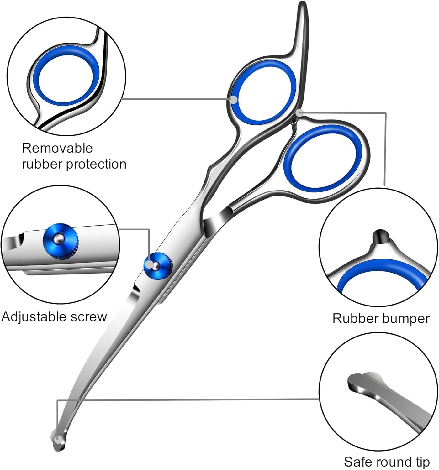 PROFESSIONAL PET GROOMING SCISSORS KIT:The curved scissors are trimming your pet’s fur around the head, body, ears, eyes, legs, and paws. The thinning scissors are thinning out your pet’s thick fur.The rounded end tips on all the pet grooming scissors for pets help to protect sensitive areas like the face, ears, eyes, nose, paws, and body when trimming, without hurting your pets.