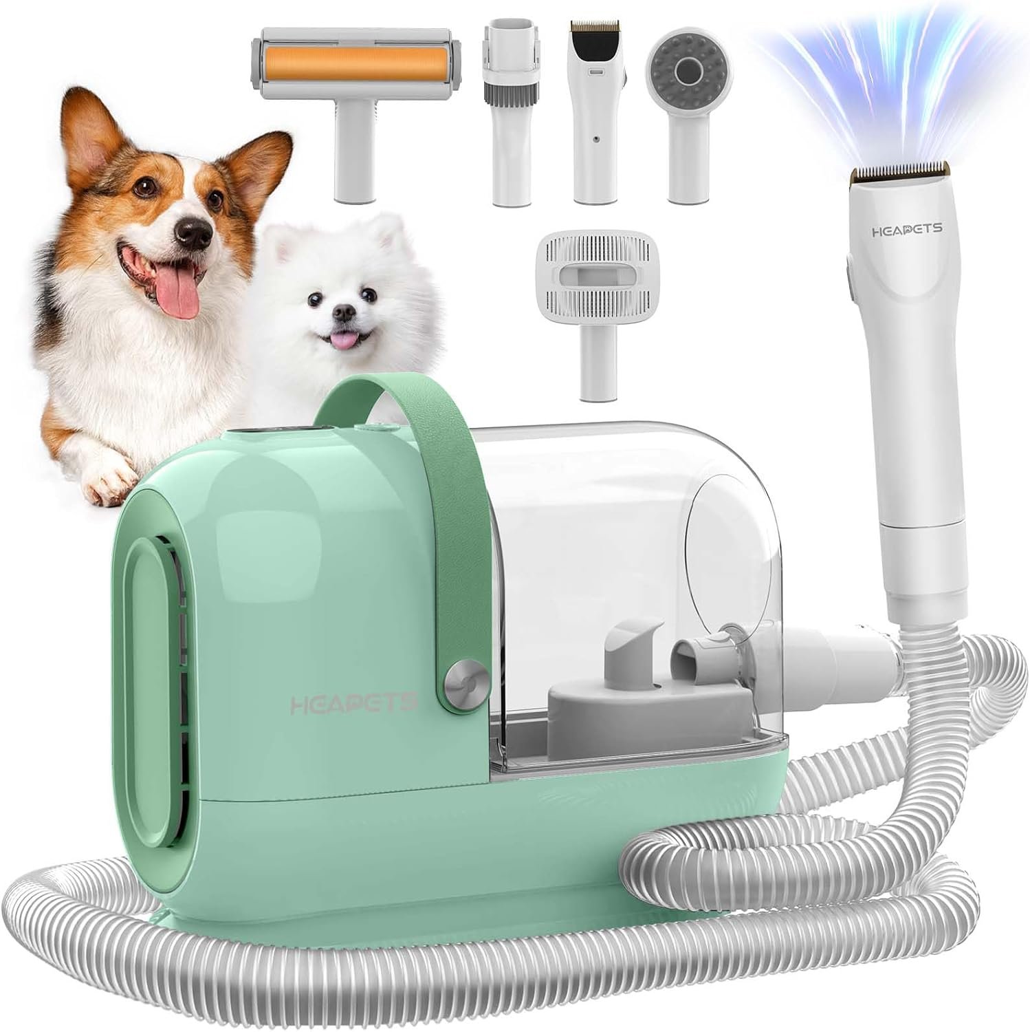 Professional Pet Salon at Home: dog shaver with vacuum comes with 7 proven tools: Grooming brush and Deshedding brush help promote a sleek and healthier hair; Hair clipper with 5 guard combs to do the haircut; Massage comb helps pet to relax; Hair Roller, Cleaning Brush and Nozzle to clean the pet hair.