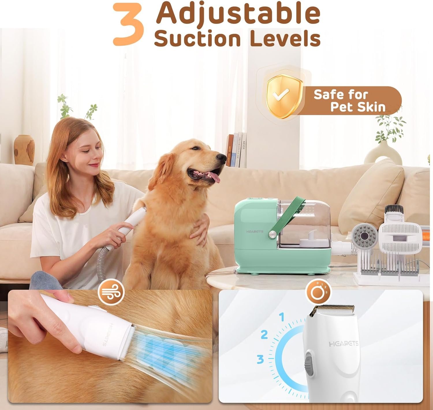 Low Noise Design: 3 adjustable suction levels to choose. We recommend using the lowest suction to help your little pet feel at ease. The dog grooming vacuum for shedding comes with everything you need to give your fur kid a DIY salon day instead of making monthly trips to the dog groomers.