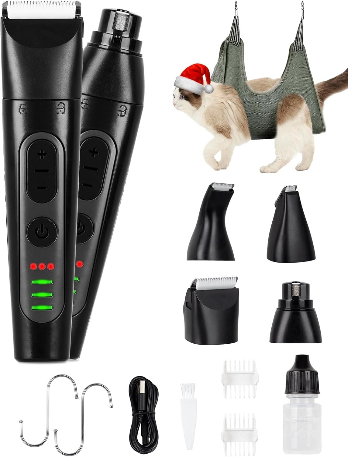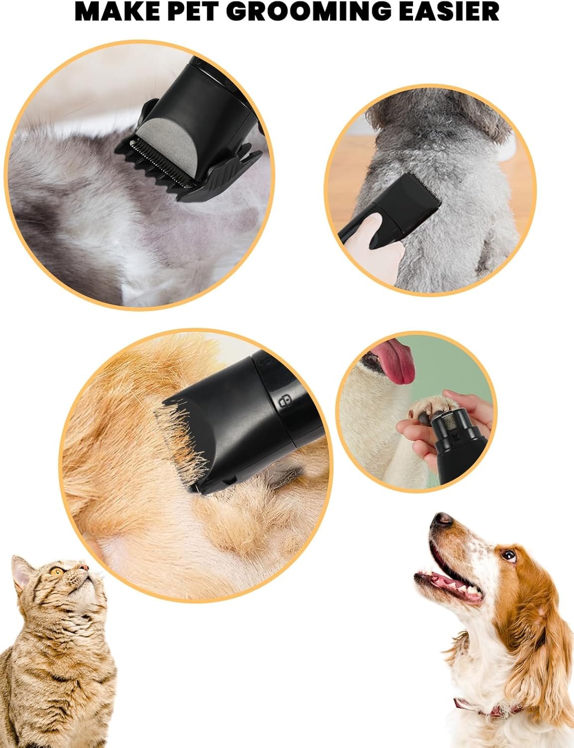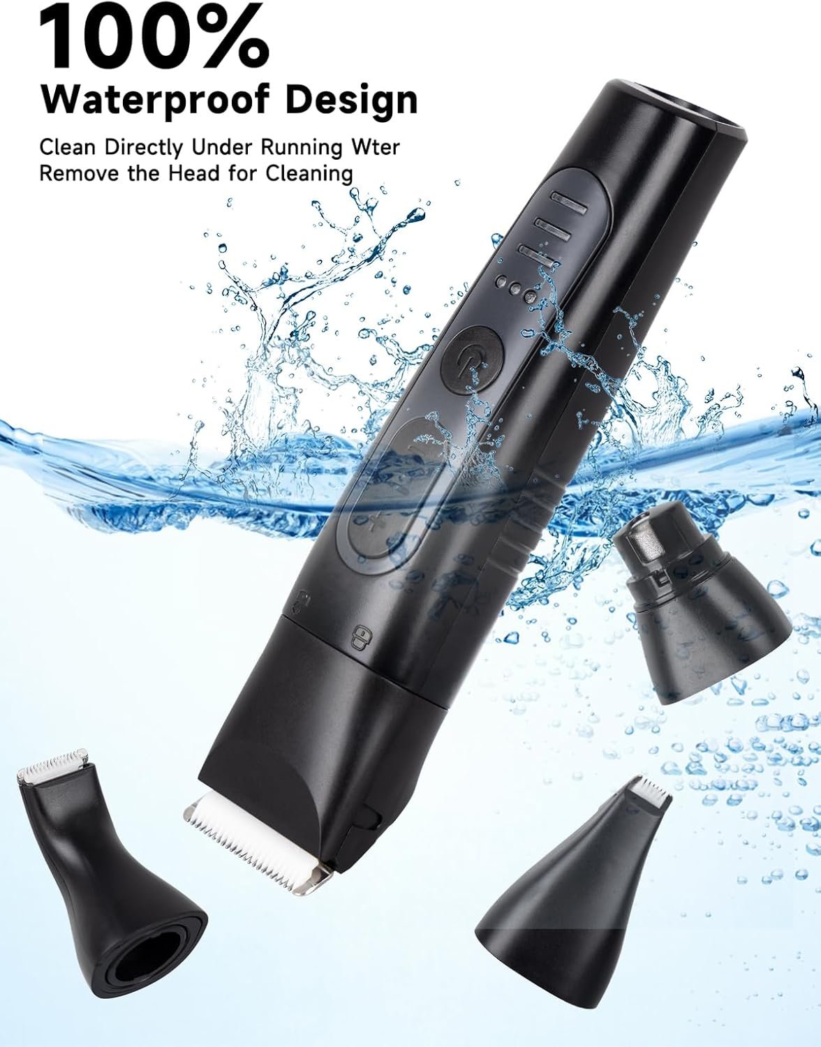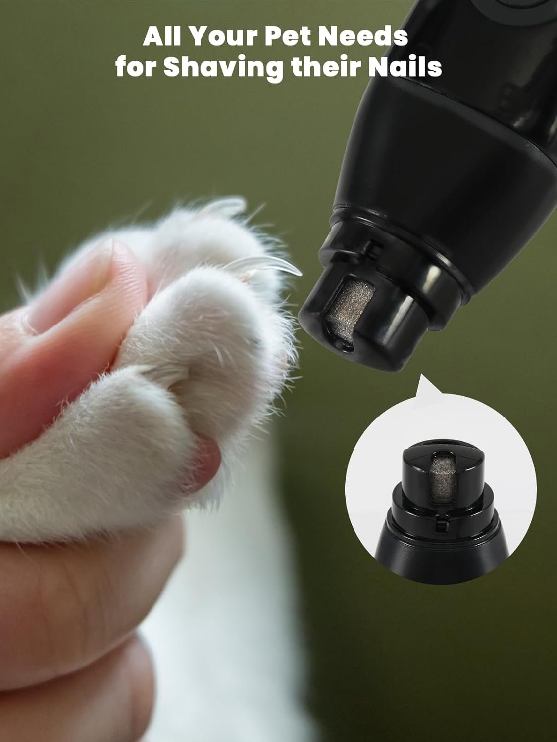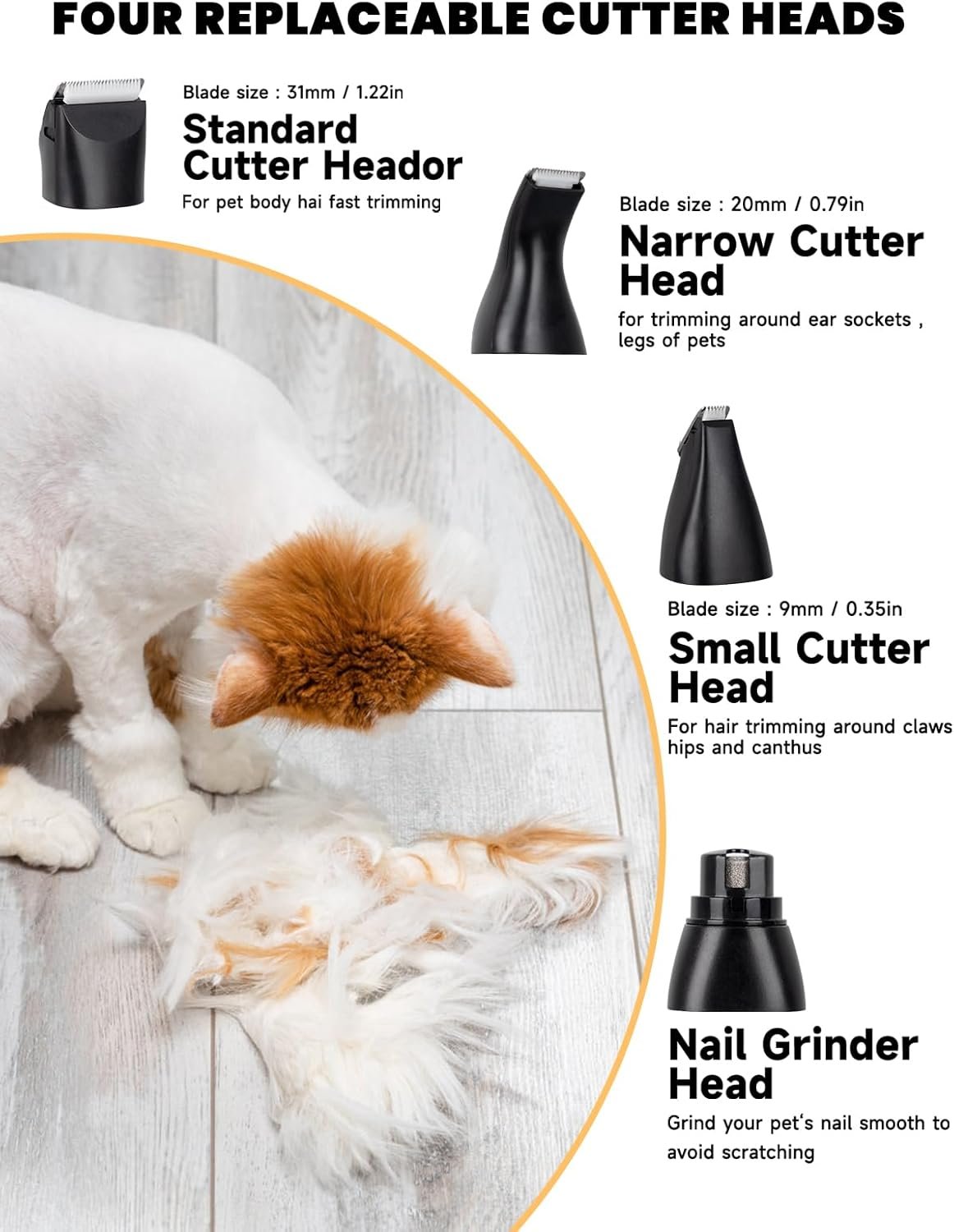 COMPLETE & APPLICABLE: 5 in 1 pet hair trimmer for dogs comes with 4 heads to meet different pet grooming needs.3 different sized trimming blades according to your needs, can be used for the hair around the cat or dog’s paws, eyes, ears, face, and hips. 1 nail grinder quickly polish pet nails without hurting hands, durable.