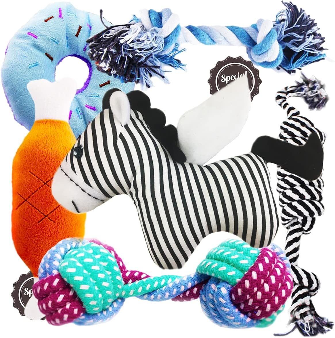 ♥THE MOST POPULAR DOG TOYS:Including squeaky zebra, ropes, donuts. Dog chew toys set