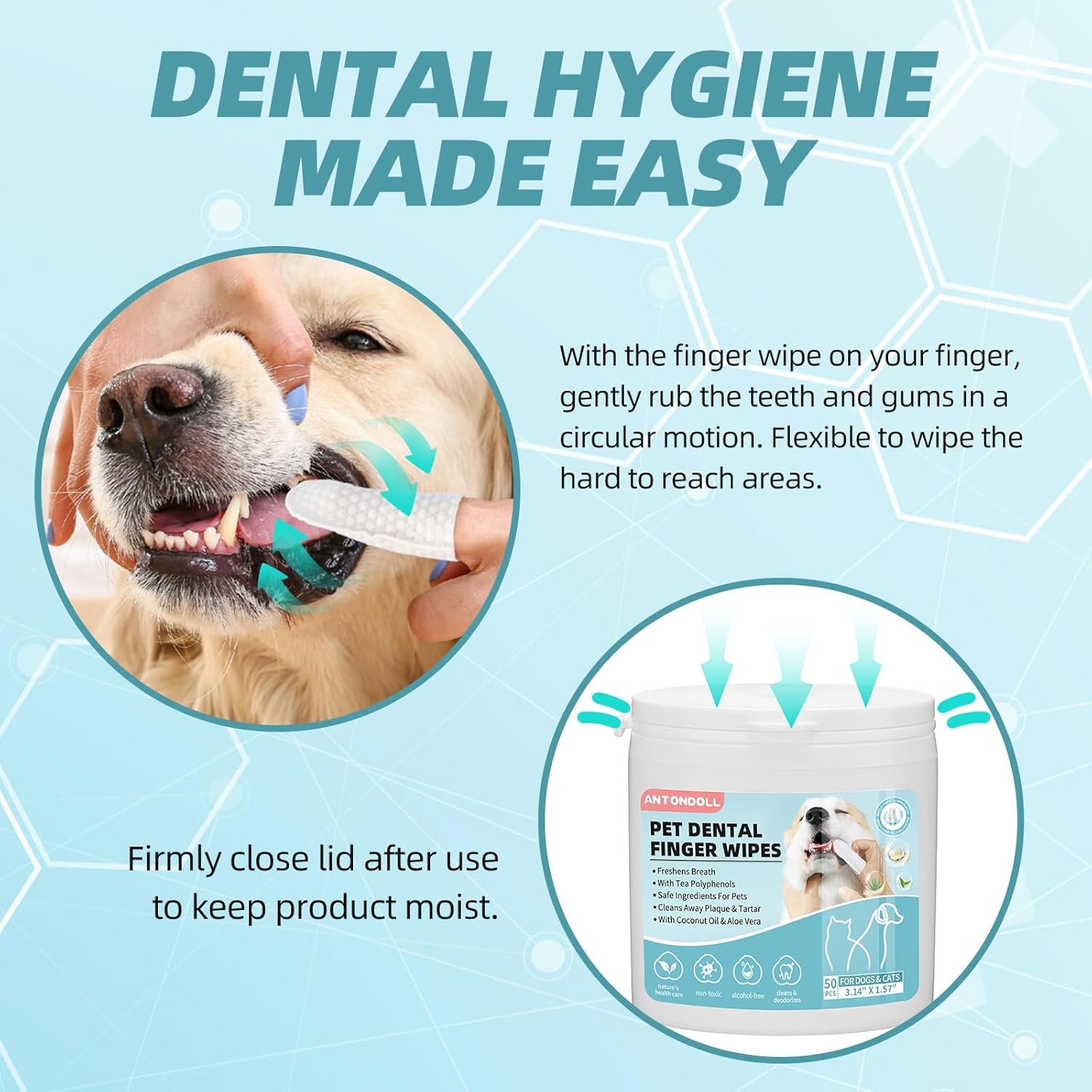 REGULAR DAILY USE: Easily and quickly wipe your dog’s teeth and gums after feeding, to help prevent dental issues. With the wipe on your finger, gently rub the teeth and gums in a circular motion. Giving your dog mouth fresh, and improved oral health anytime, anywhere.