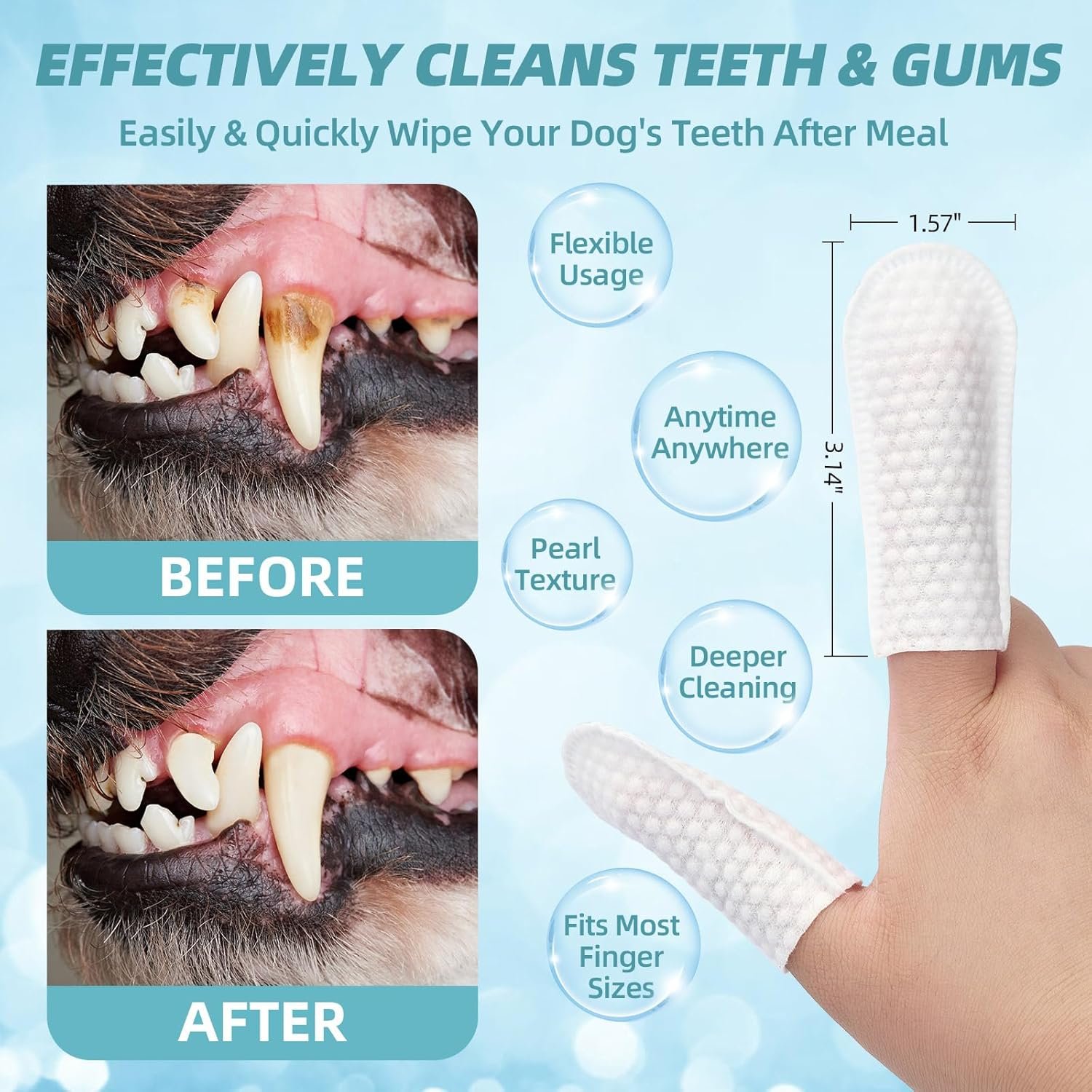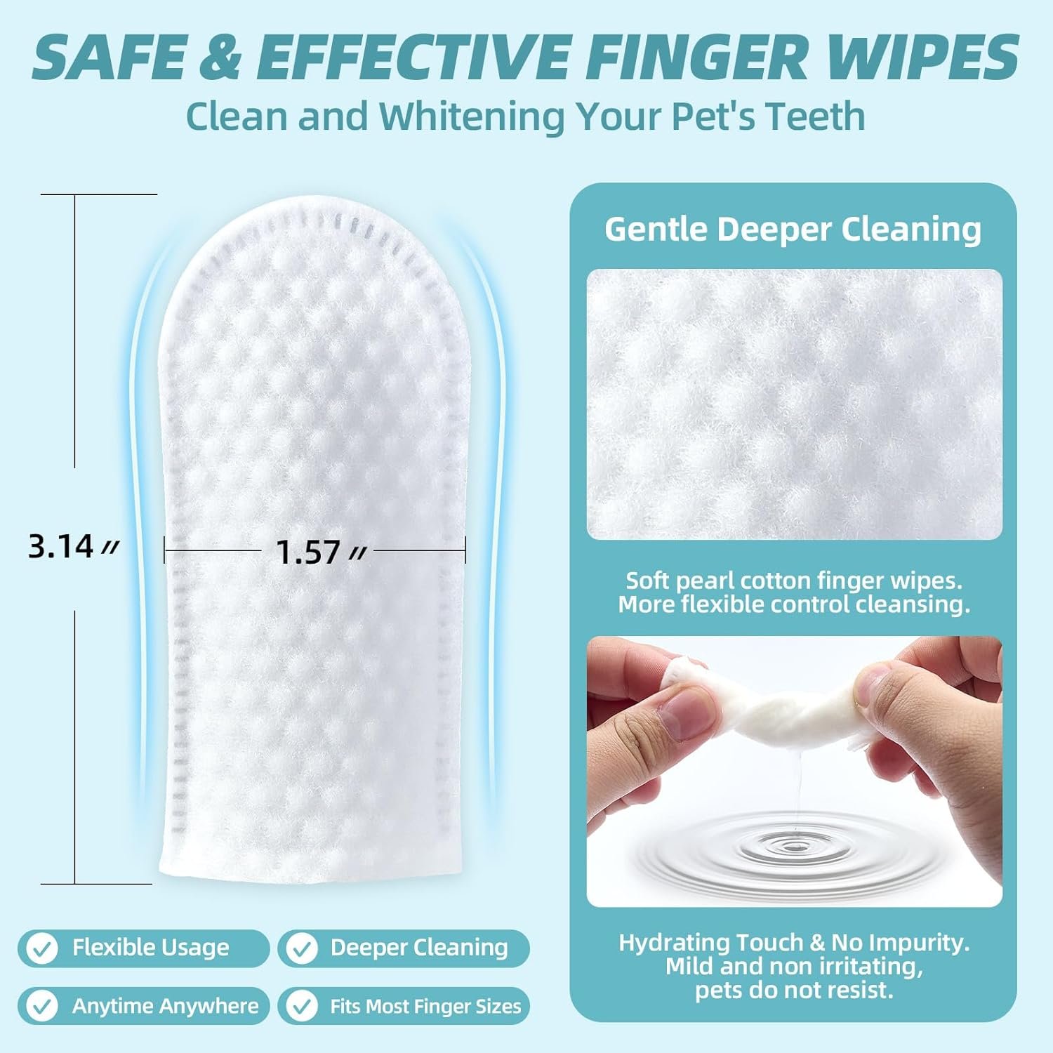 VET FORMULATED: Our teeth cleaning wipes for dogs & cats are meticulously formulated by veterinarians for use and undergo rigorous quality testing. Soft cotton material pet dental finger wipes are more flexible to wipe the hard to reach areas of your pet teeth and gums for more effectively removing bad breath.