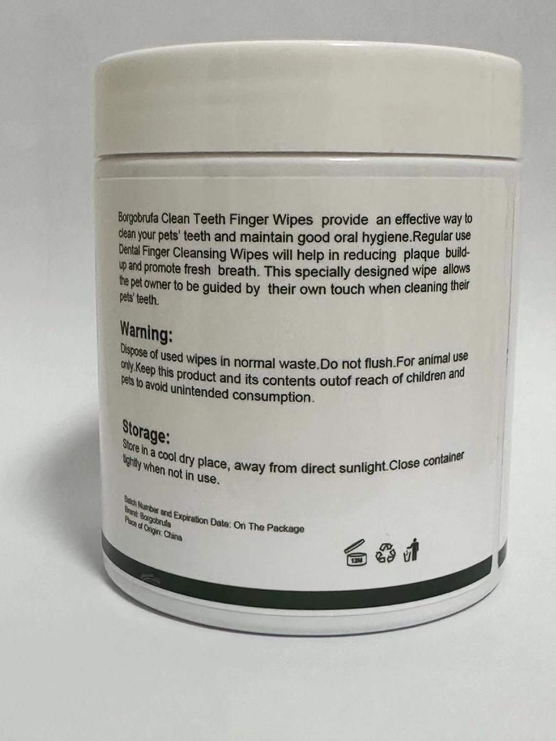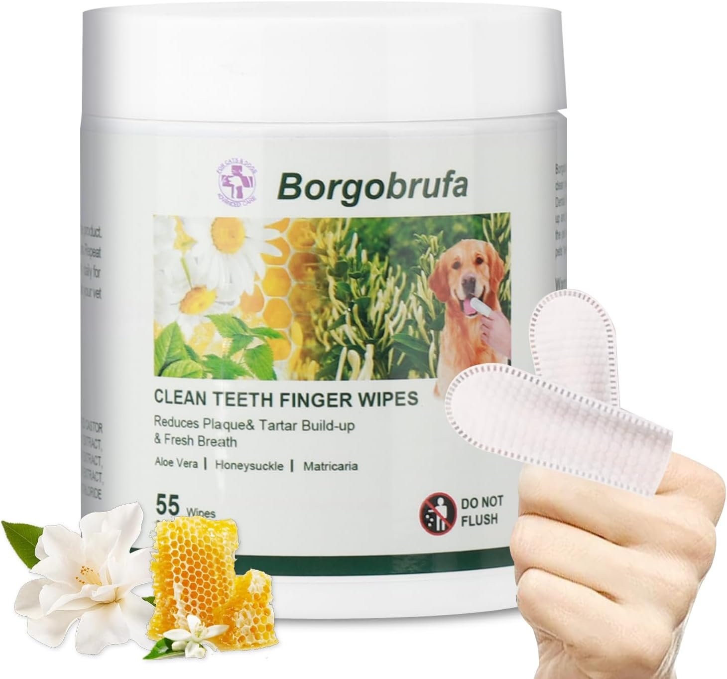 Borgobrufa CLEAN TEETH FINGER WIPES Reduces Plaque& Tartar Build-up& Fresh Breath Aloe Vera+ Honeysuckle +Matricaria 55 Wipes 3.27″×1.54″ Borgobrufa Clean Teeth Finger Wipes provide an effective way to clean your pets’ teeth and maintain good oral hygiene. Regular use Dental Finger Cleansing Wipes will help in reducing plaque build-up and promote fresh breath. This specially designed wipe allows the pet owner to be guided by their own touch when cleaning their pets’ teeth. DIRECTIONS FOR USE: For Dogs &Cats. Introduce your pet to the smell and texture of the product. Gently rub the teeth and gums in a circular motion. Repeat with clean finger wipes if necessary Clean teeth daily for best results. We recommend that your pet visits your vet periodically for professional check-ups. Contains:WATER,GLYCERIN,SORBITOL,PEG-40 HYDROGENATED CASTOR OIL,CAMELLIA SINENSIS POLYPHENOLS,HONEY EXTRACT,LONICERA JAPONICA (HONEYSUCKLE) FLOWER EXTRACT,CHAMOMILLA RECUTITA (MATRICARIA) FLOWER EXTRACT,MENTHA ARVENSIS EXTRACT,CETYLPYRIDINIUM CHLORIDE Warning: Dispose of used wipes in normal waste. Do not flush. For animal use only. Avoid contact with eyes. Keep this product and its contents out of reach of children and pets to avoid unintended consumption. Storage: Store in a cool dry place, away from direct sunlight. Close container tightly when not in use. Batch Number and Expiration Date: On The Package Brand: Borgobrufa Place of Origin: China