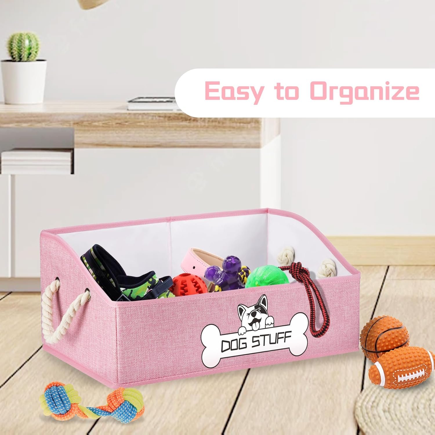 The dog toys basket with size of 19.5 (L) x 11 (W) x 8.5 (H) inches can store plenty of your friend’s accessories, such as dry dog treats,leash,long dog leash, collar, toys, blanket, outfits, etc.