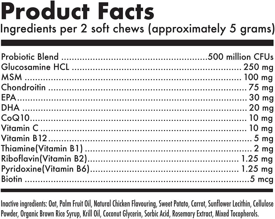 HIP & JOINT HEALTH: these soft chews include a perfect blend of the glucosamine and chondroitin to help maintain and support joint flexibility and mobility, reduce stiffness or soreness associated with normal daily activity. Helps maintain a normal inflammatory response