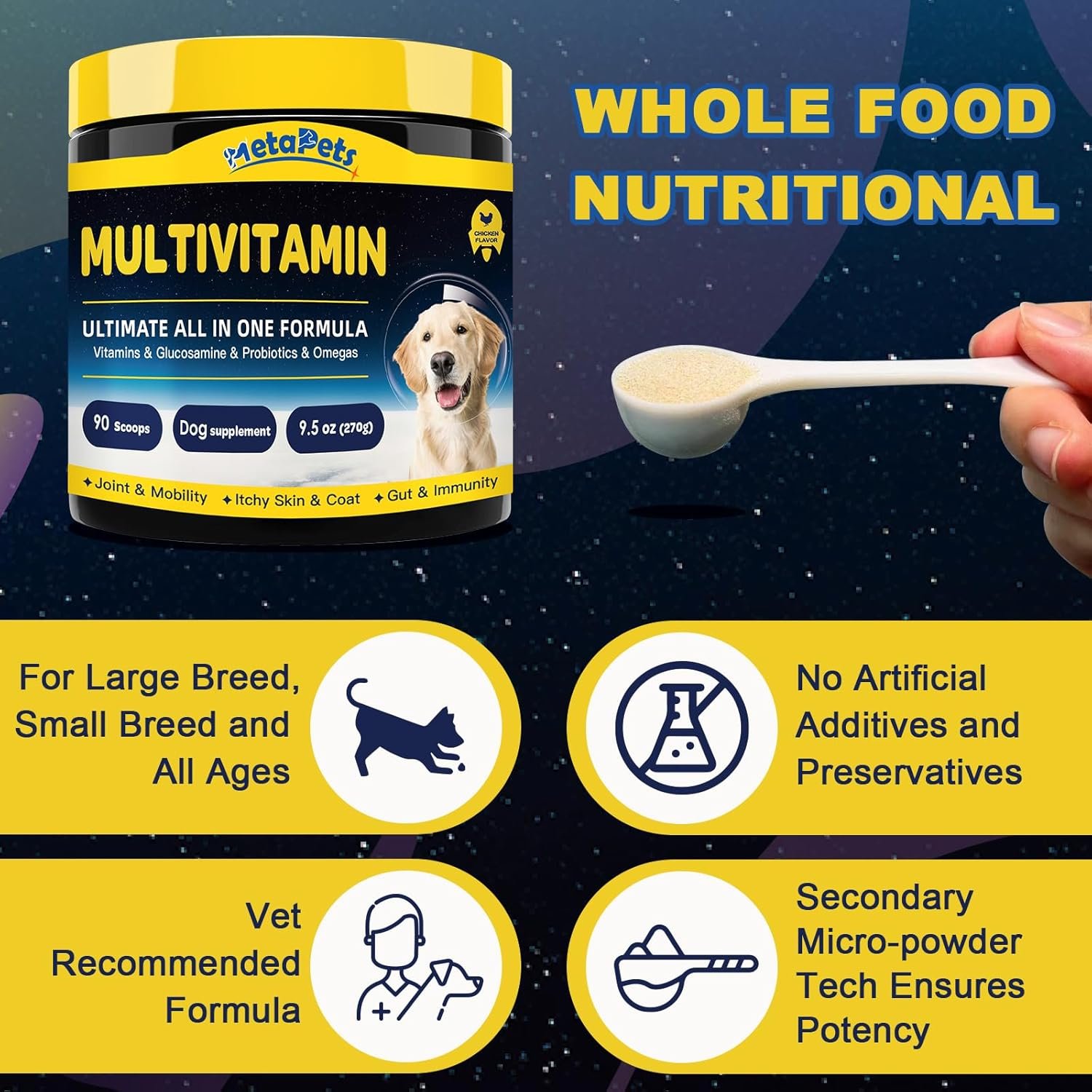 MAXIMUM POTENCY, NATURAL AND TASTY – With goat milk powder, dehydrated chicken, the natural & chicken flavor multivitamin powder ensures each serving is a tasty dog food toppers that your dog will eagerly look forward to adding to their daily routine. With secondary micro-powder technology, it is effective to incorporate nutrition into your dog’s meals, ensuring they receive the essential support without any fuss. Formulated without corn, wheat, soy. No artificial preservatives or flavors.