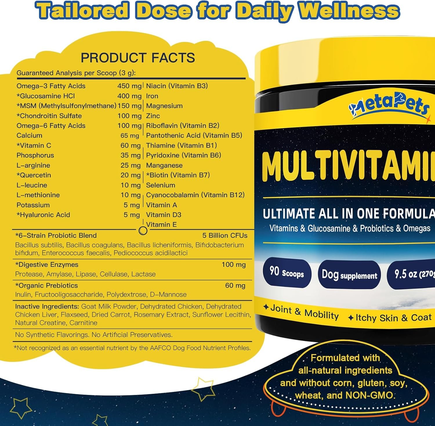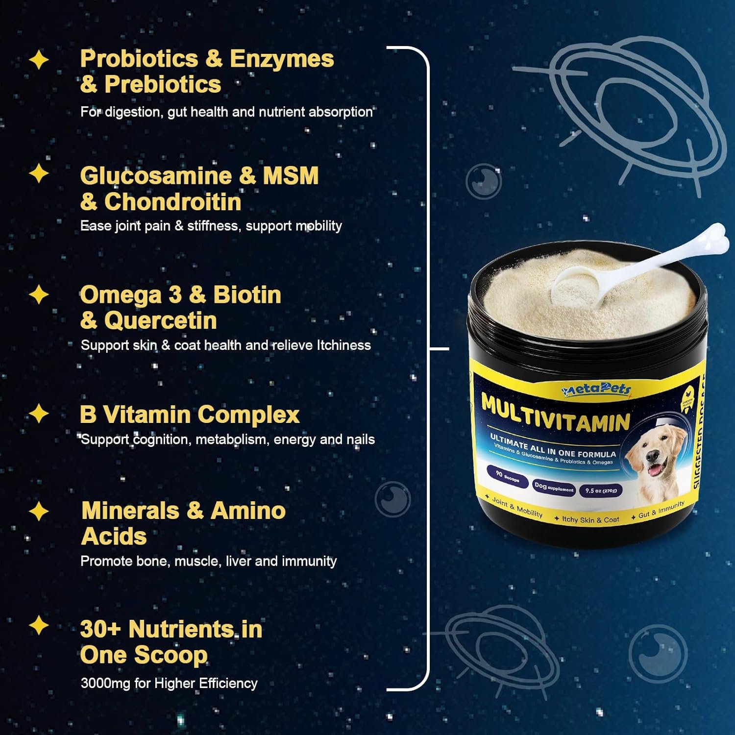 VET-DESIGNED TO SUPPORT OVERALL & IMMUNE HEALTH – Our dog vitamins and supplements powder is packed with over 30 nutrients that nurture your dog’s well being. Each ingredient, carefully selected, like Probiotics, Glucosamine, Omegas, Vitamin A, E, C, B complex, Minerals & Animo Acids, plays a vital role in bolstering the immune system, cognitive & overall health. 90 scoops provide a 45-day and up to 6-month supply offering a balanced blend of daily essentials to support energy and longevity.