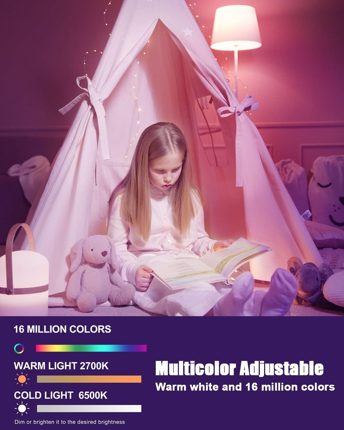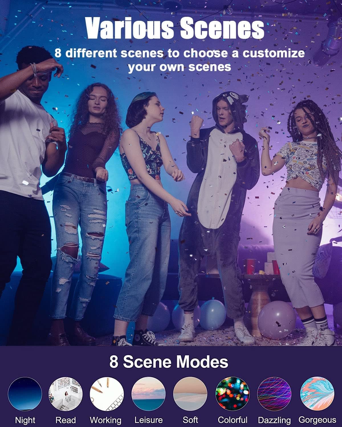 Multi Colored & White: RGB +Cold +Warm White led light bulb choose what you want with 16million colors and adjust the brightness as needed. There are 8 modes for you to choose, and support scene DIY, as a night light perfect for family gatherings, Halloween and Christmas decorations