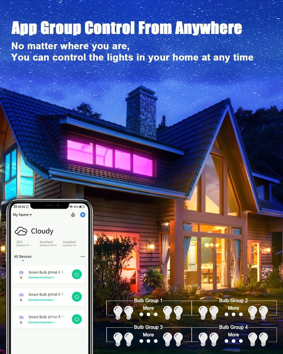 Memory & Group Control: This small light bulb can memorize the last color or mode we used. You can create a group for multiple wifi bulbs on the APP, and control the color changes of them at the same time, so that each area of your room becomes a unique theme scene and you can create your favorite atmosphere