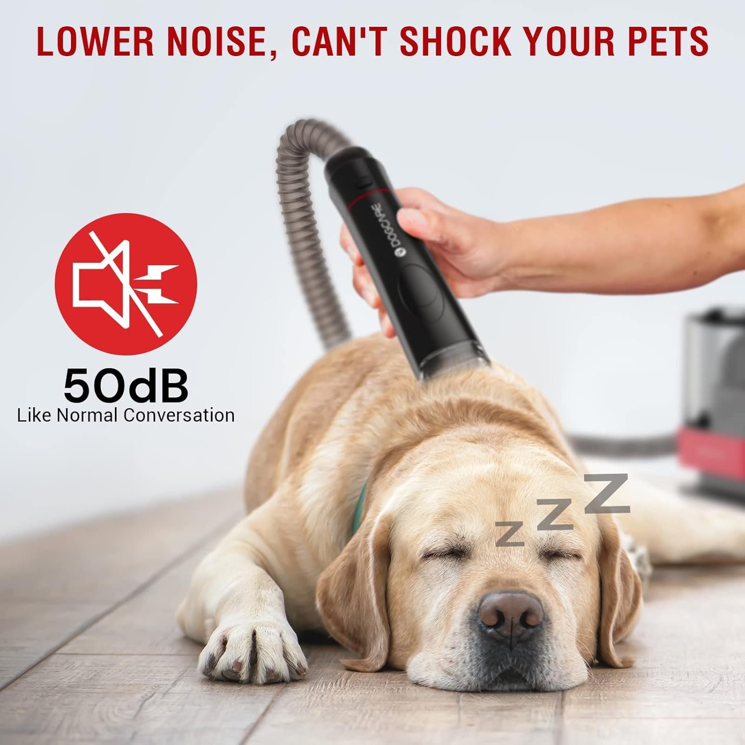 [Ultra-Low Noise]: Usually, some pets get stressed and uneasy by the sound and the vibration of the pet clippers. But the noise of our grooming vacuum kit at home is lower than 55 dB. It is just similar to the voice of our normal conversation. Completely no-effect on your pet!