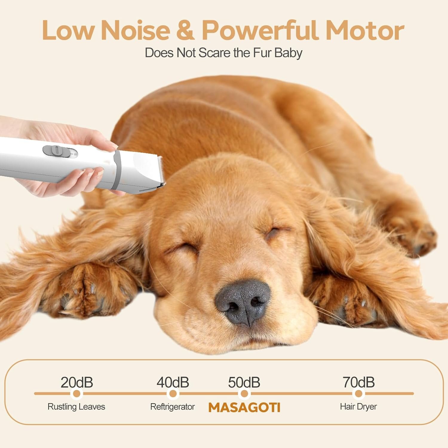 Low Noise & Powerful Motor: MASAGOTTI Ultra Quiet Pet Grooming Tools at work is only about 50dp, Perfect balances between powerful trimming and low-noise operation. Ensure that your pet feels comfortable during the grooming process without causing any discomfort. This dog trimming kit gives your pet peace of mind and never be afraid to cut their hair again.