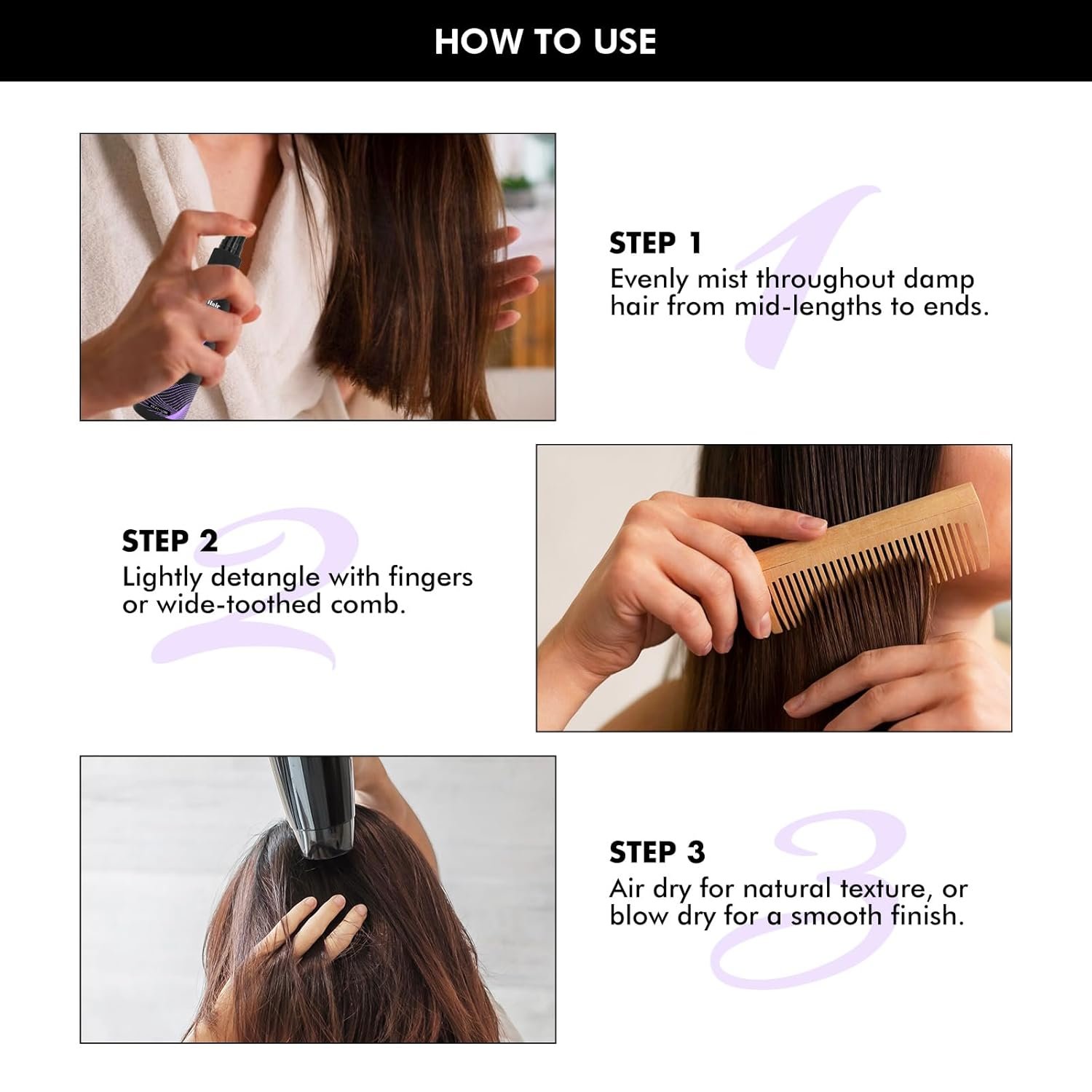 How to use:1.Evenly mist throughout damp hair from mid-lengths to ends. 2.Lightly detangle with fingers or wide-toothed comb. 3.Air dry for natural texture, or blow dry for a smooth finish.