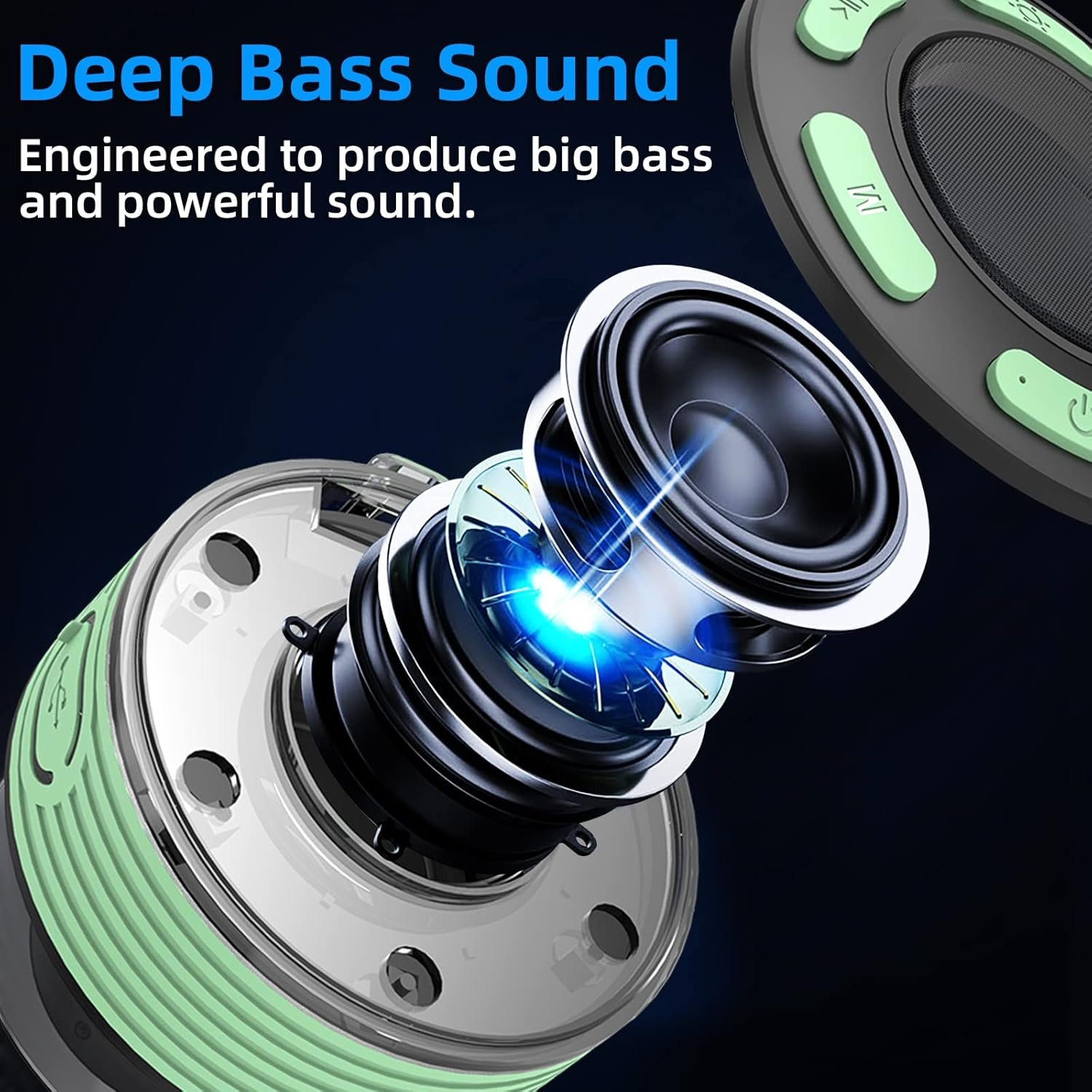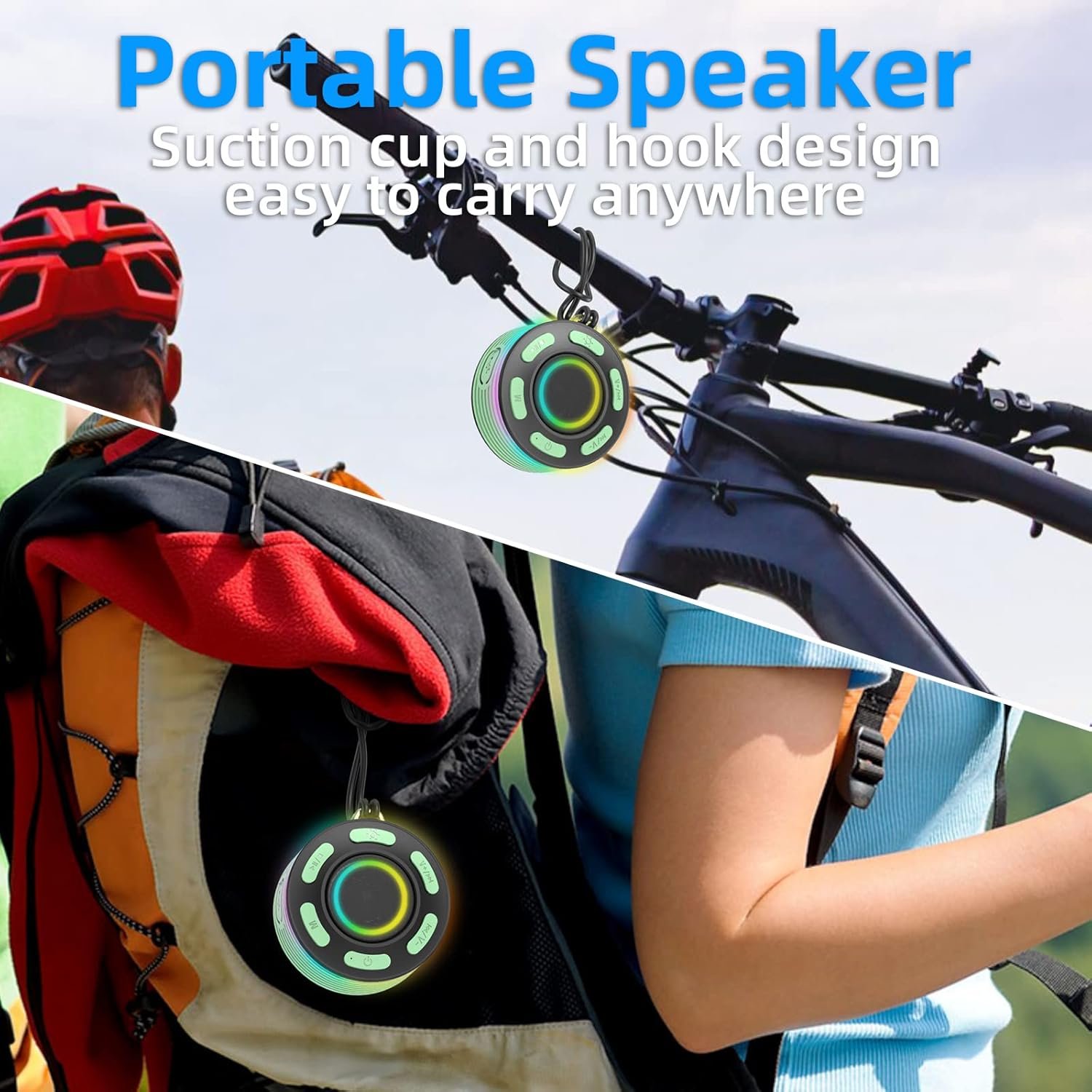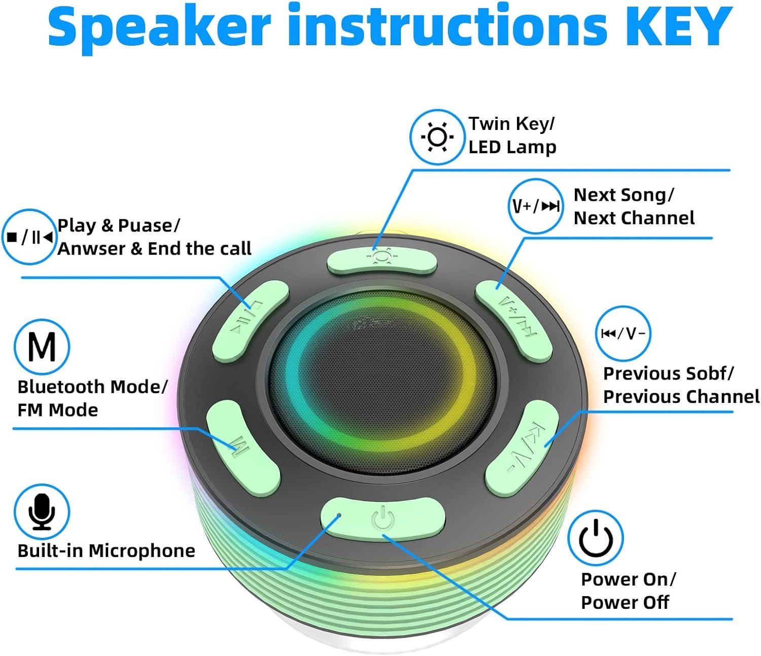 multi funtion: the wireless speakers has five light modes, gradient lights would truly bring you party atmosphere. come with a suction cup, easy to attach in bathroom tiles and mirrors. great also as a mini speakers in the car as it suctions to your car windscreen. built in mic for handsfree calls from phone. compact, handheld size.