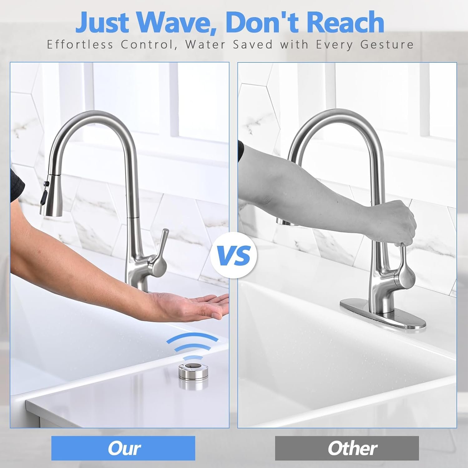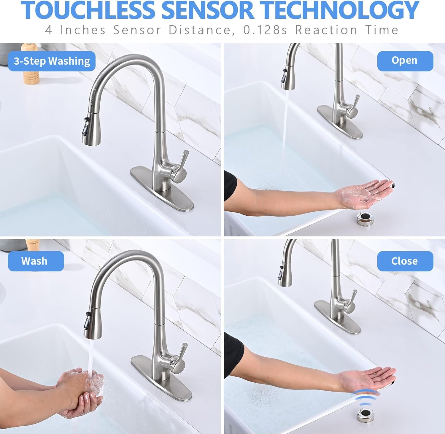 Touchless Technology: NO need to touch the kitchen faucets; simply wave your hand to turn the water on and off in 0.128 seconds