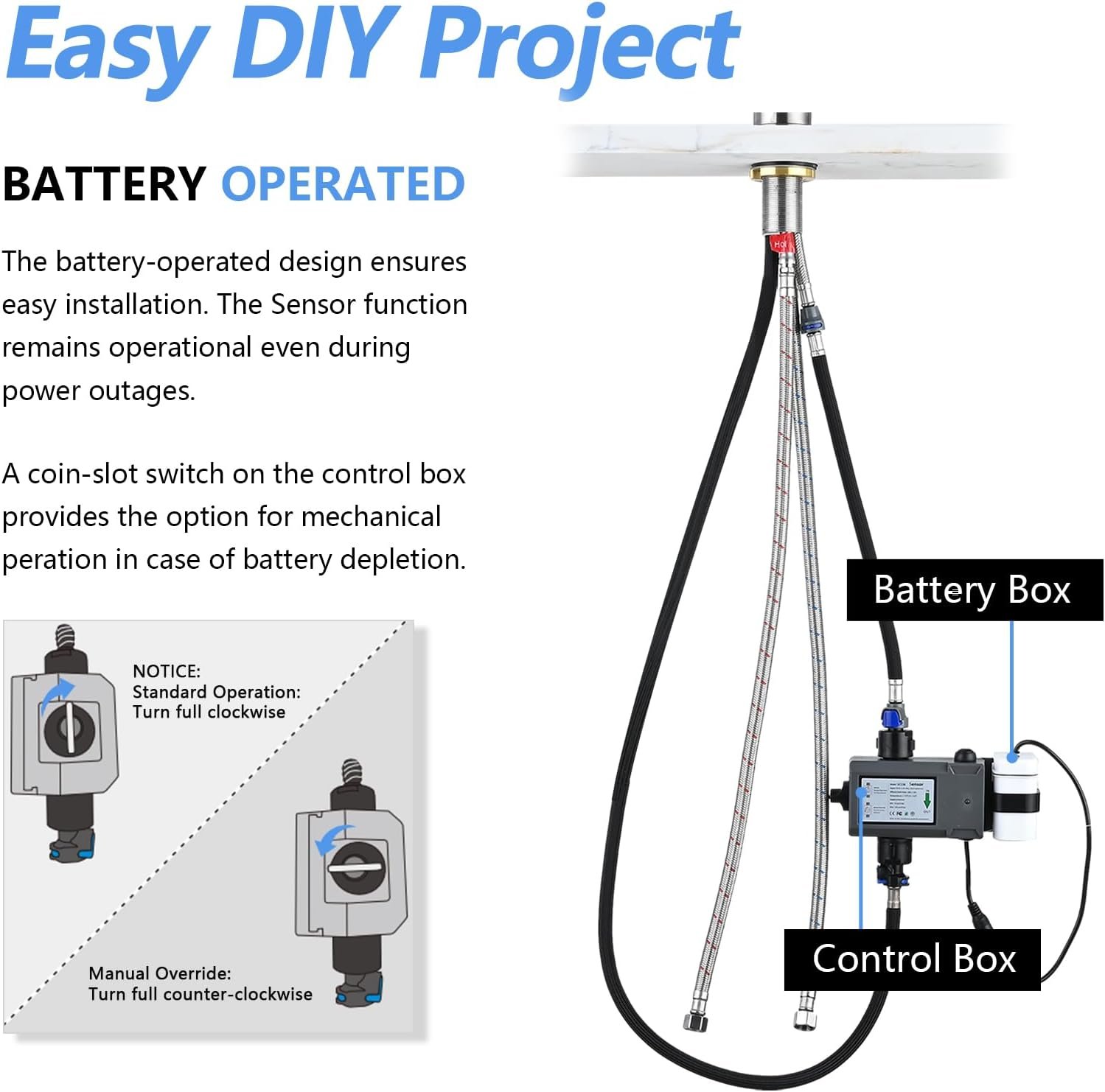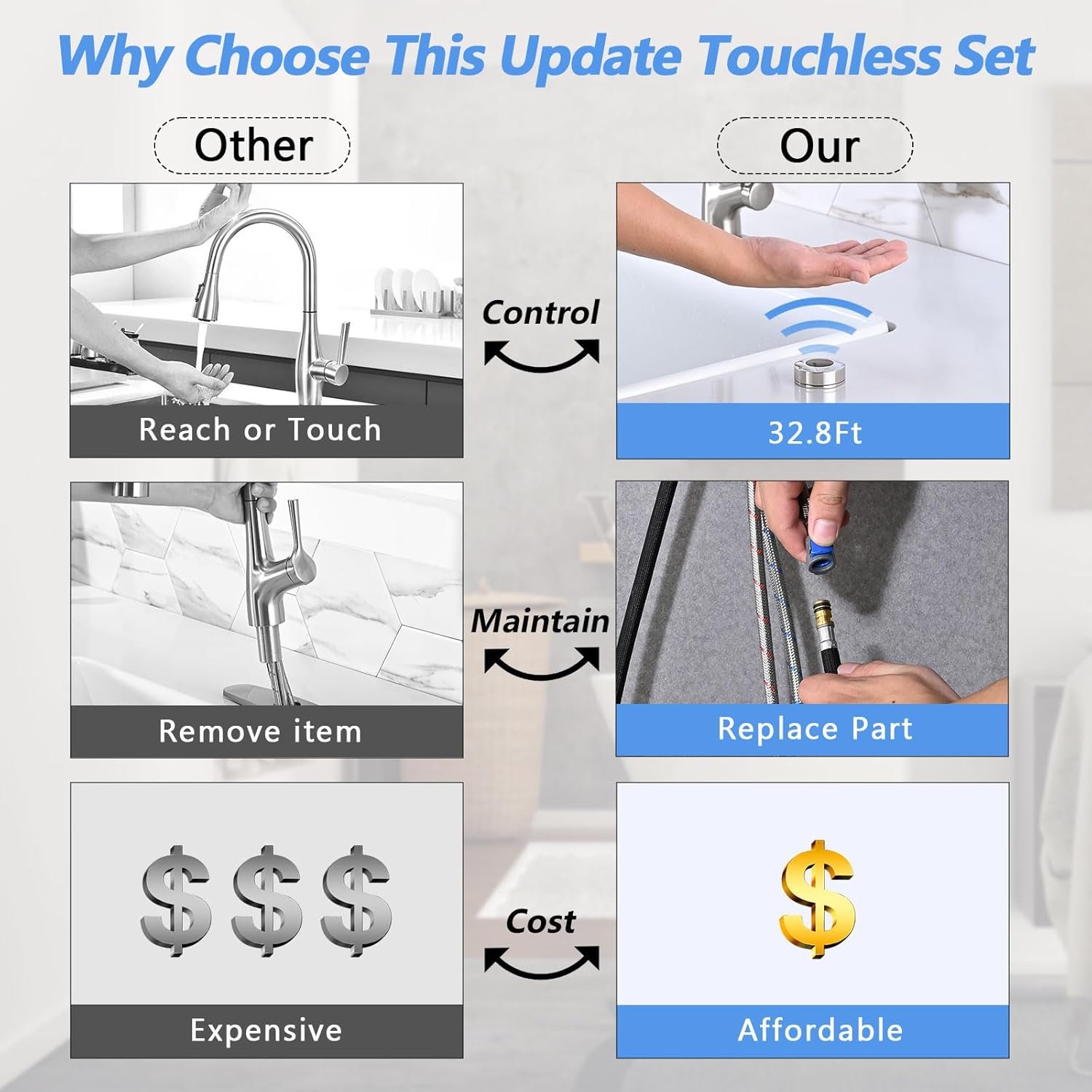 Wide Range Control: Control the touchless faucet from up to 33 feet away, allowing for use without having to be reach or touch the smart faucet, saving time and reducing your water bill (instant on/off)