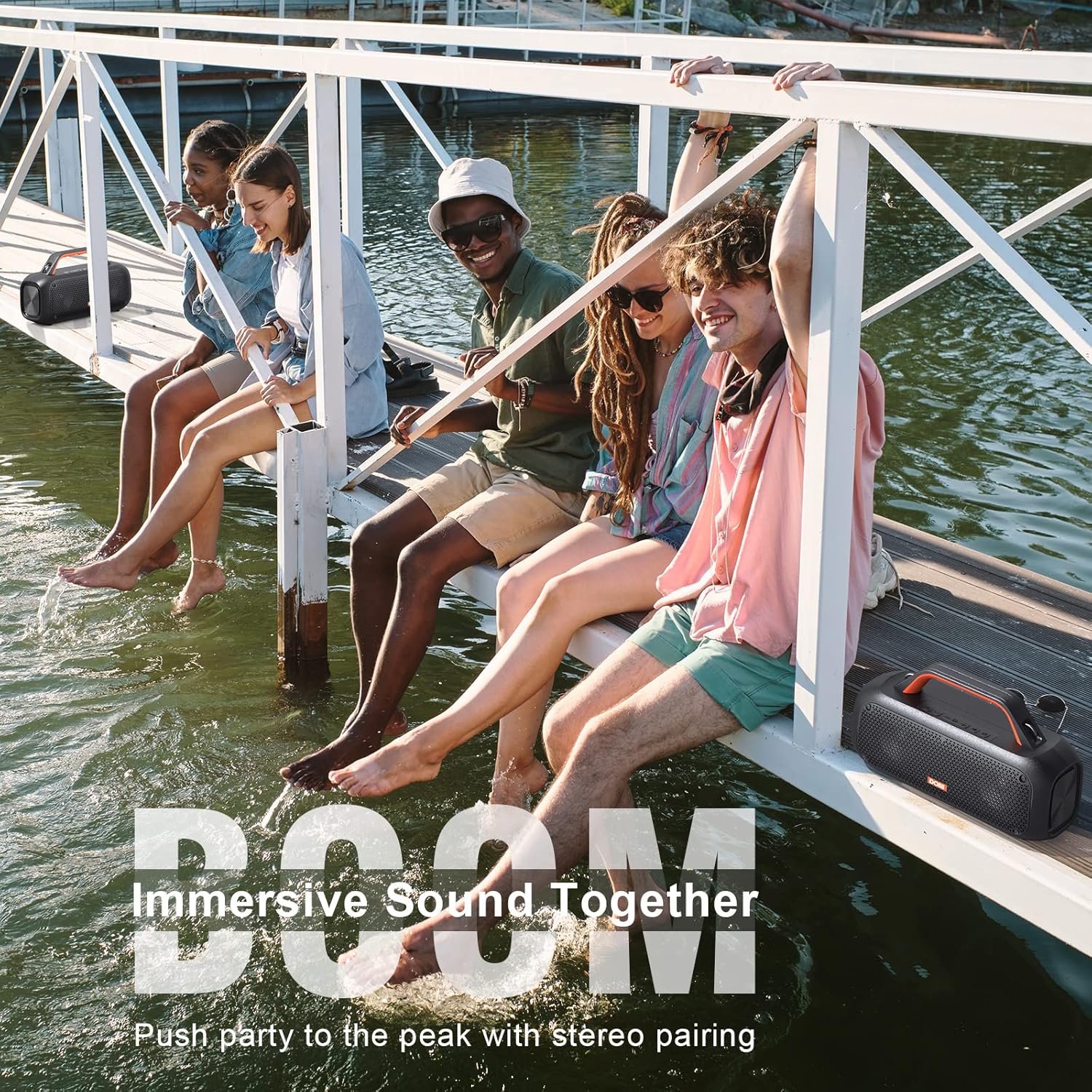 IPX6 Waterproof: Born for outdoor adventures, the waterproof speaker is covered with rugged and seamless material and can survive against spilled drinks, rain, and even water sprays from all directions (Not Submerged in Water).