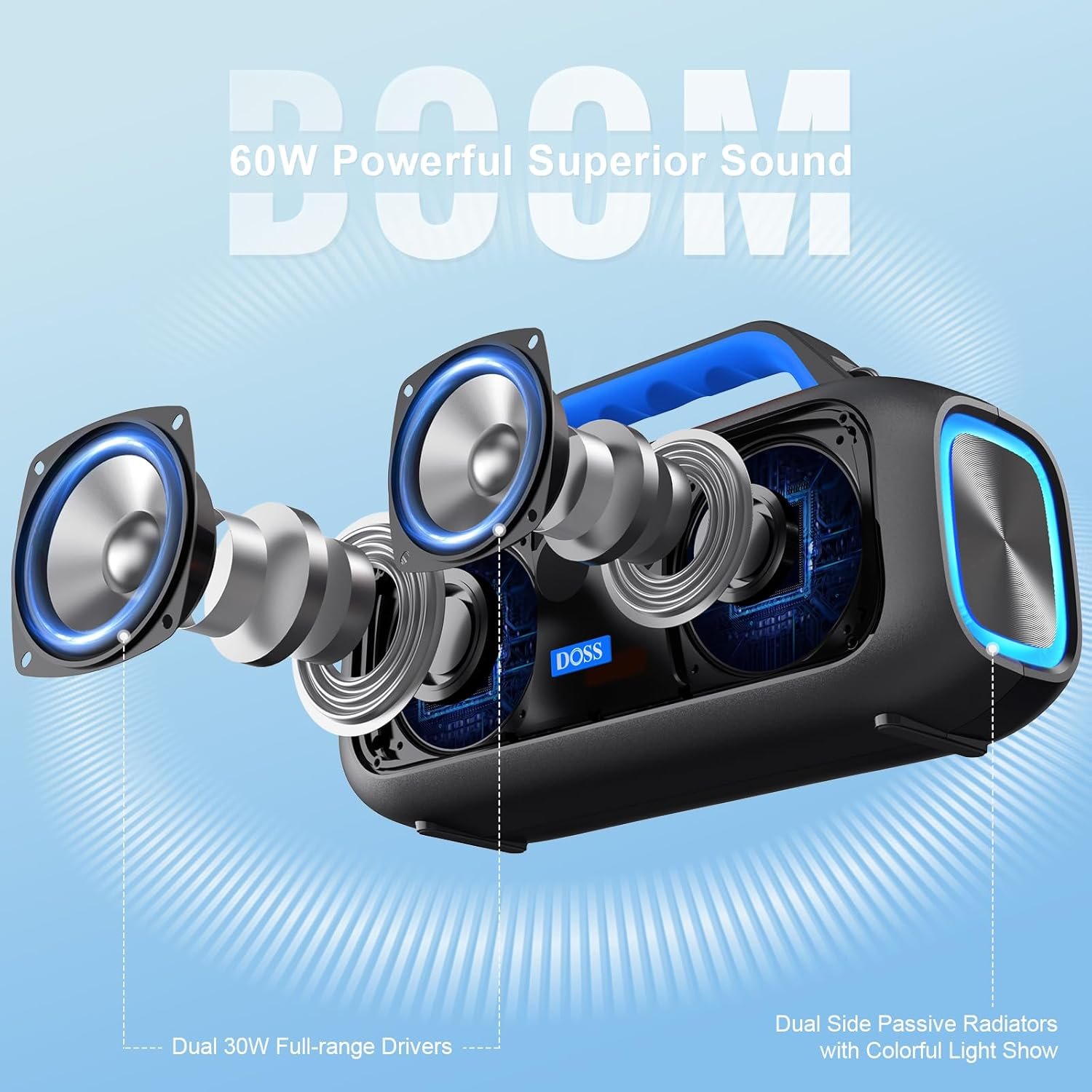 60W Full-range Sound: Equipped with two 30W drivers and dual passive radiators, this speaker delivers a 60W full-range audio experience with powerful bass and crisp highs.