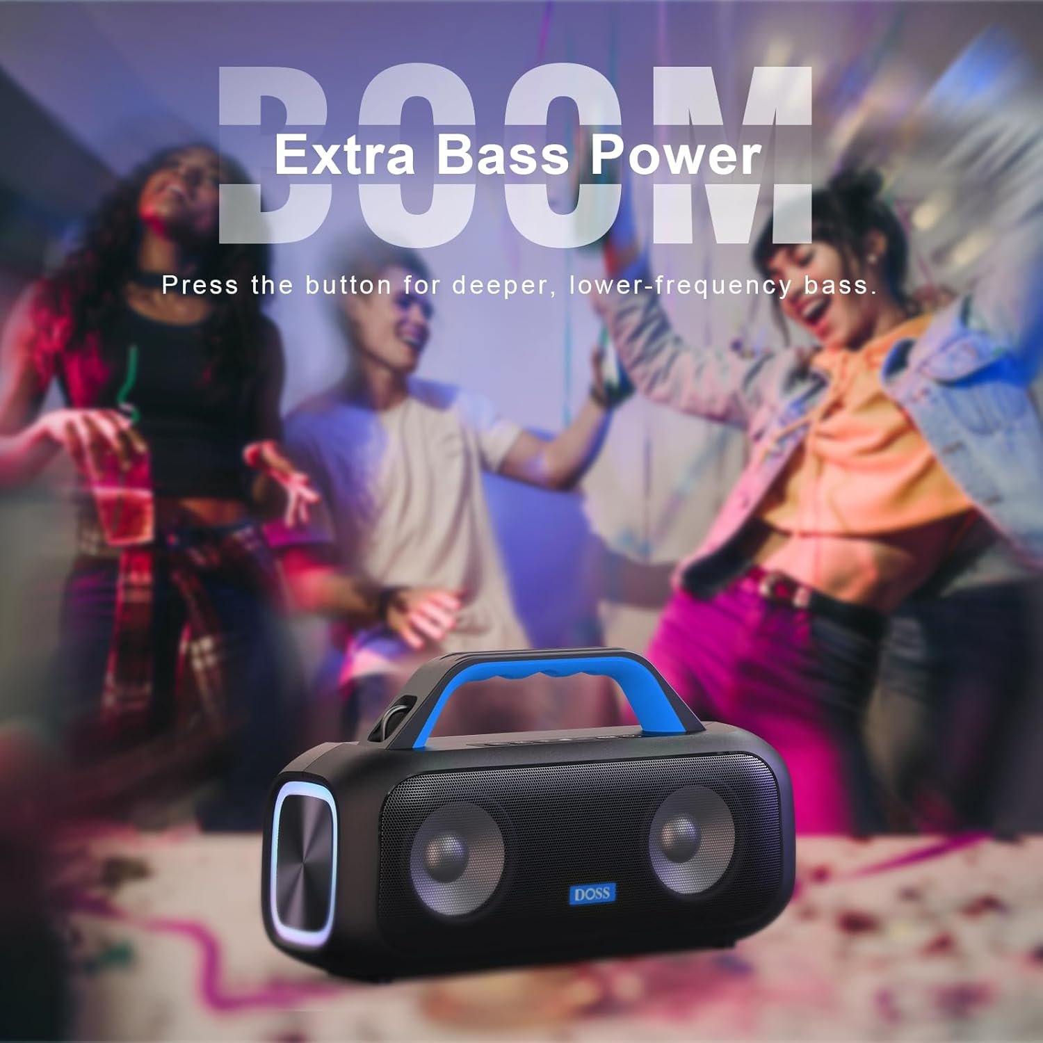 Wireless Stereo Pairing: Double the sound power for a bigger party experience. Connect two DOSS Extreme Boom S speakers wirelessly for an immersive stereo sound soundscape and take the energy of your party to new heights.