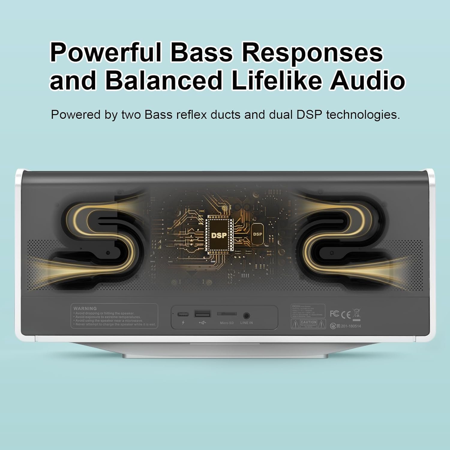 Loud Clear Sound: The speaker utilizes dual DSP technology to enhance sound quality. It fine-tunes audio for balanced sound, compensating for the speaker box combination, and employs various audio processing algorithms to minimize distortion.