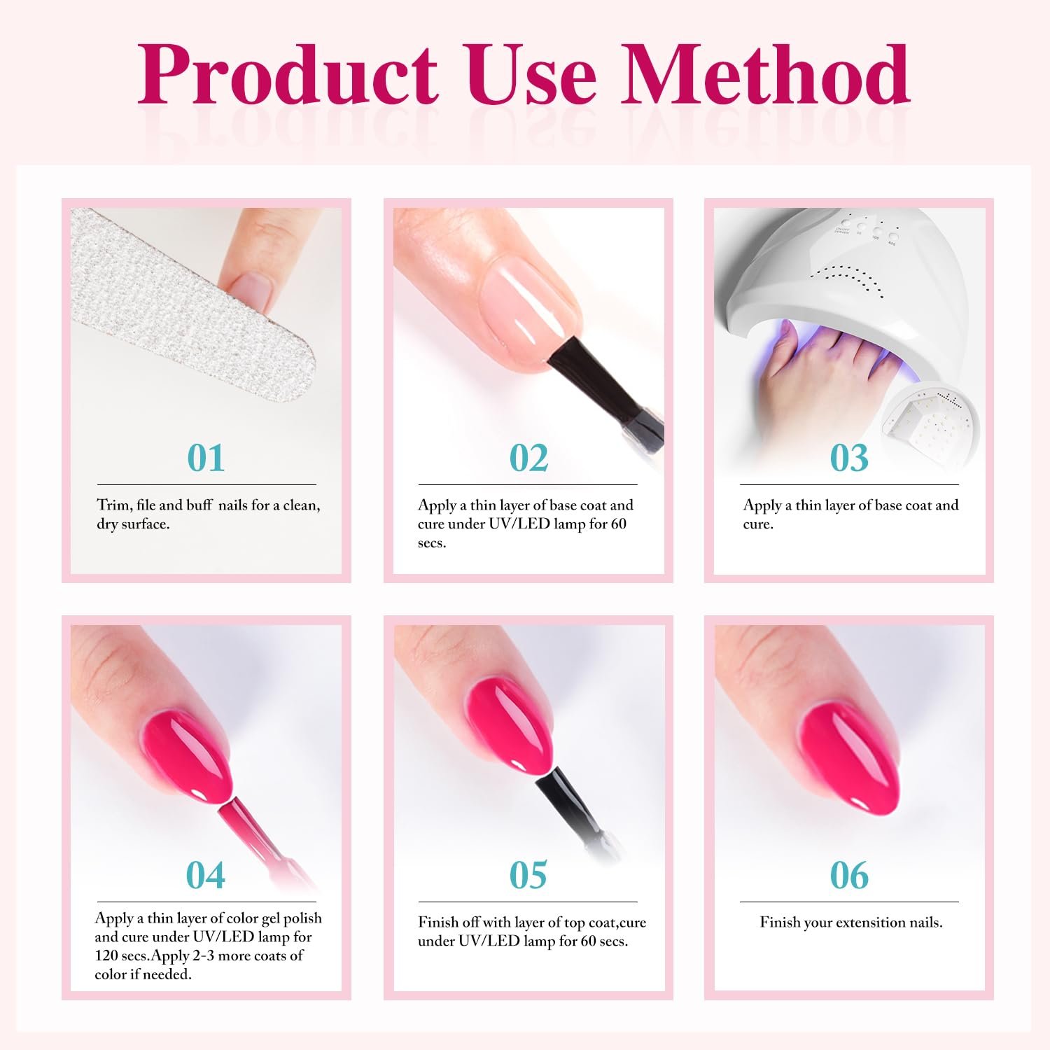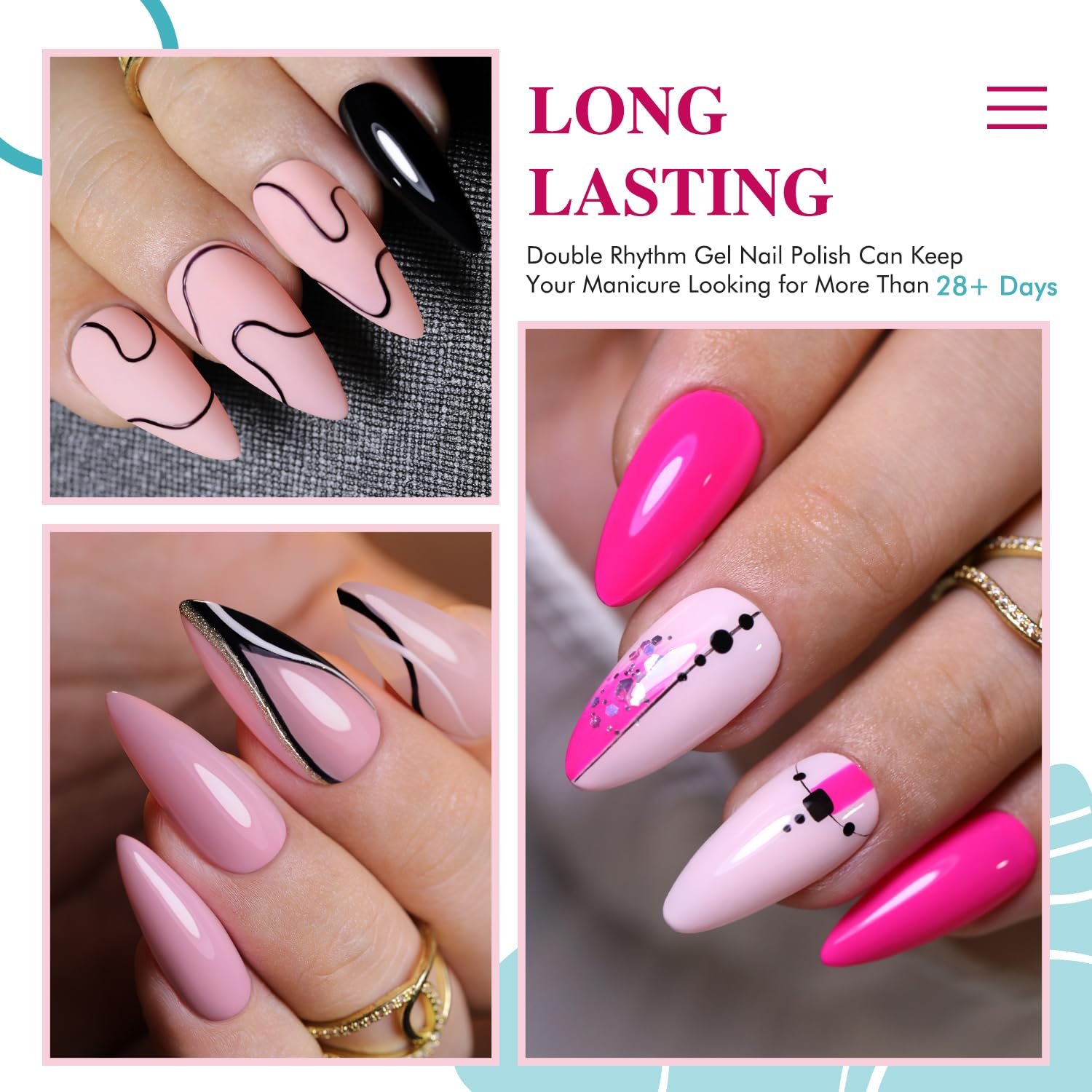 Pink Gel Nail Polish Set: Double Rhythm pink gel nail polish kit includes 6colors 7.5ml / 0.26 fl.oz gel nail polish. This pink gel nail polish set includes light pink,milky pink ,baby pink ,pink glitter ,nude pink and neon pink 6 colors. They can be combined with each other arbitrarily, so you can creat your own nail art sthle.