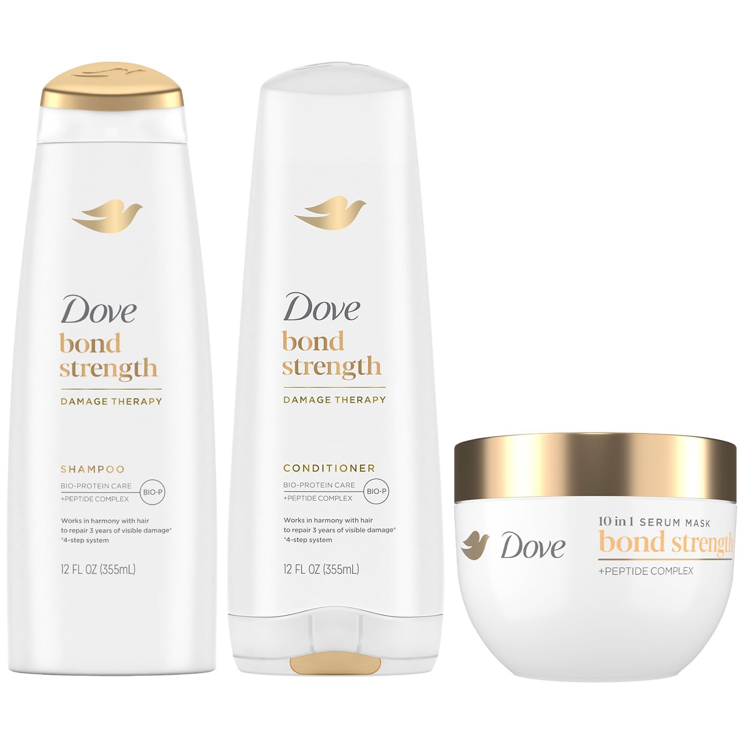 HAIR DAMAGE THERAPY: The Dove bond repair bundle includes a shampoo and conditioner (12 oz ea) that repair and strengthen hair bonds damaged by styling and environmental stressors.