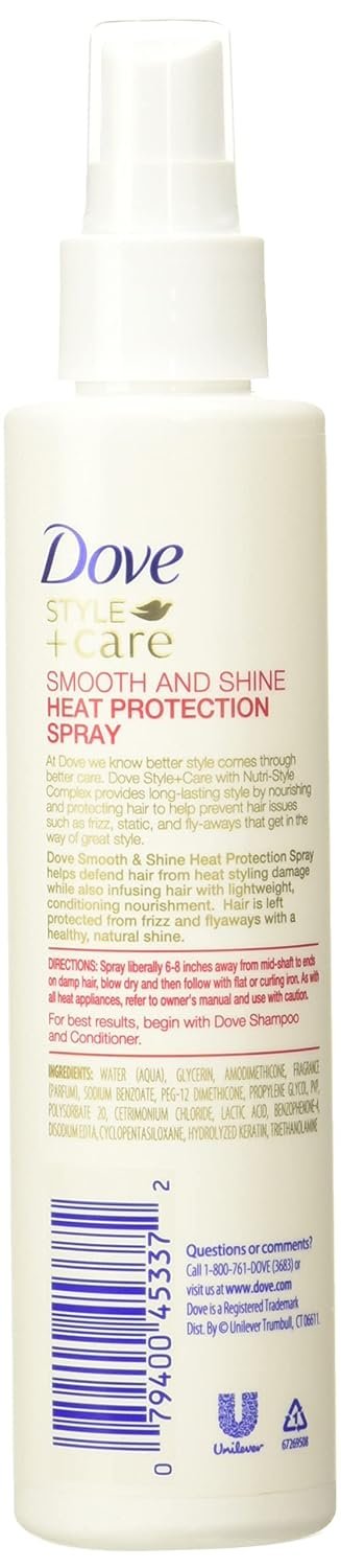 Defends hair from heat styling damage while also infusing hair with lightweight, conditioning nourishment for smooth, shiny, and protected hair. Defends hair from heat styling damage Prevents hair issues such as frizz, static, and fly-aways Leaves hair protected with a healthy, natural shine Infuses hair with lightweight, conditioning nourishment Provides long-lasting style Best if used after washing hair with Dove Shampoo and Conditioner At Dove, we know better style comes through better care. Dove Style+Care with Nutri-Style Complex provides long-lasting style by nourishing and protecting hair to help prevent hair issues such as frizz, static, and fly-aways that get in the way of great style. Dove Style+Care Smooth & Shine Heat Protection Spray helps defend hair from heat styling damage while also infusing hair with lightweight, conditioning nourishment. Hair is left protected from frizz and fly-aways with a healthy, natural shine. Water (Aqua), Glycerin, Amodimethicone, Fragrance (Parfum), Sodium Benzoate, PEG-12 Dimethicone, Propylene Glycol, PVP, Polysorbate 20, Cetrimonium Chloride, Lactic Acid, Benzophenone-4, Disodium EDTA, Cyclopentasiloxane, Hydrolyzed Keratin, Triethanolamine Defending against heat styling Dove Heat Protection Spray protects against heat styling damage while also providing long-lasting style. Beating frizz Get a handle on hair issues like frizz, static and fly-aways – even in damp or humid weather. Nourishment and shine Infuse your hair with lightweight conditioning nourishment for a healthy, natural shine. Before using a heat styling tool, spray liberally onto damp hair from 6-8 inches away, going from mid-shaft to the ends. For best results, use with Dove Shampoo and Conditioner.