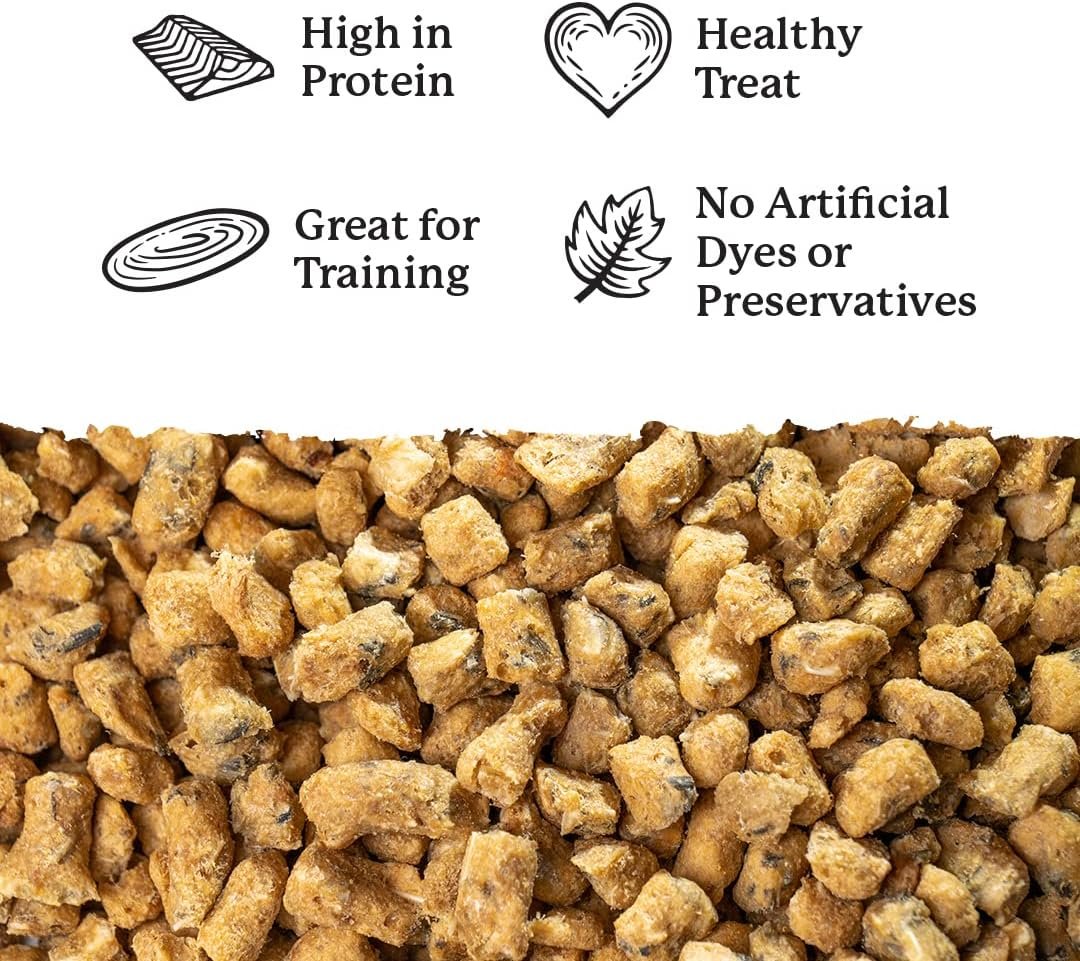 Dogs Love Salmon Bites – Made of yummy natural Wild Alaskan Salmon carefully freeze dried for long lasting enjoyment. You get a generous 7 ounce pack that supplies your dog with lots of real salmon flavor. Every dog of all sizes and breeds jumps for joy when you offer these. It’s the perfect nutritious treat to add energy, healthy nutrients, and good mood.