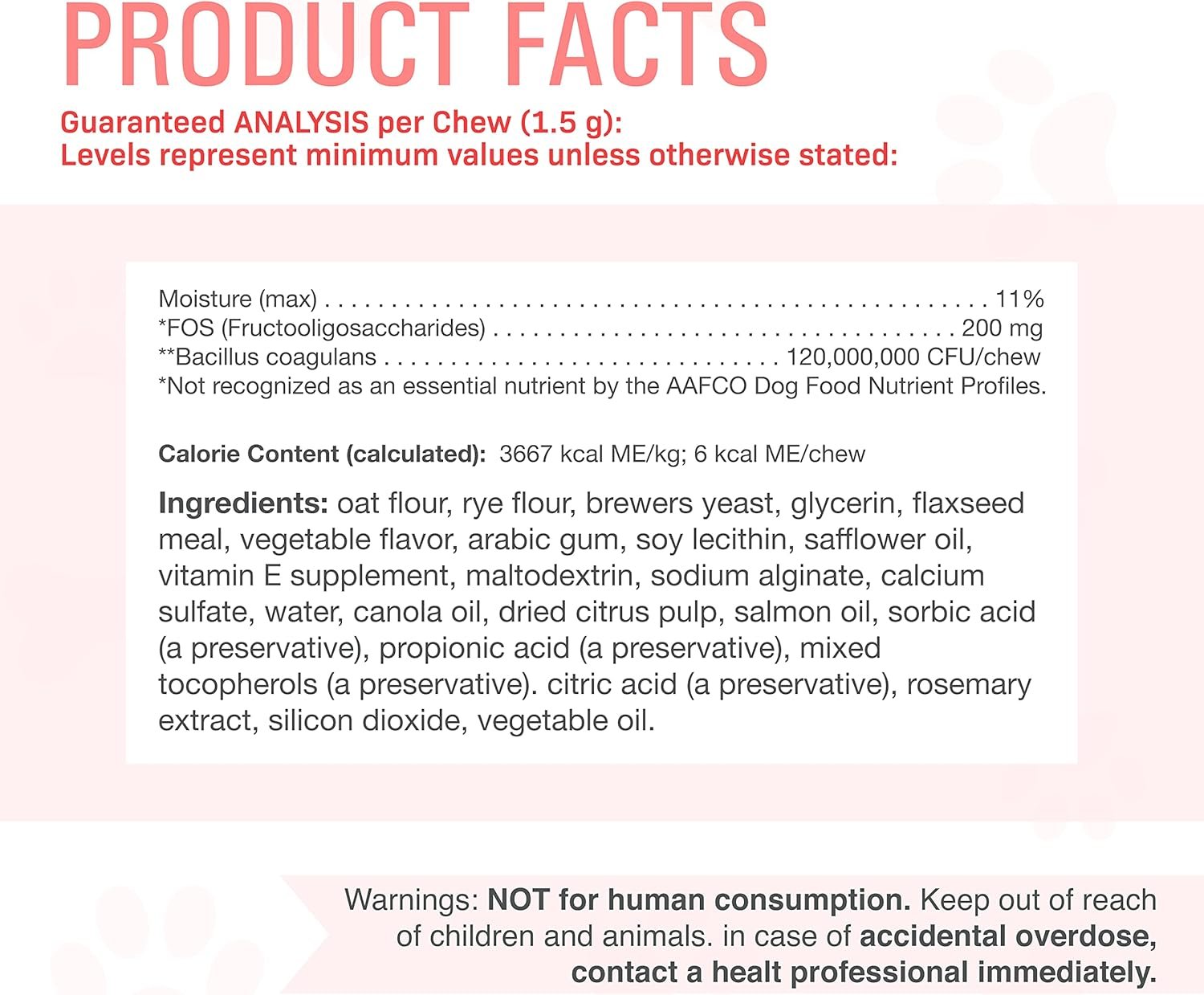 200mg FOS Fiber – Fructooligosaccharides are soluble fibers and prebiotics ideal for supporting the growth of beneficial microbes in the intestinal tract. They work to keep out harmful factors while providing more fiber for improved regularity and less discomfort. Your dog achieves better over-all health turning more foods to energy