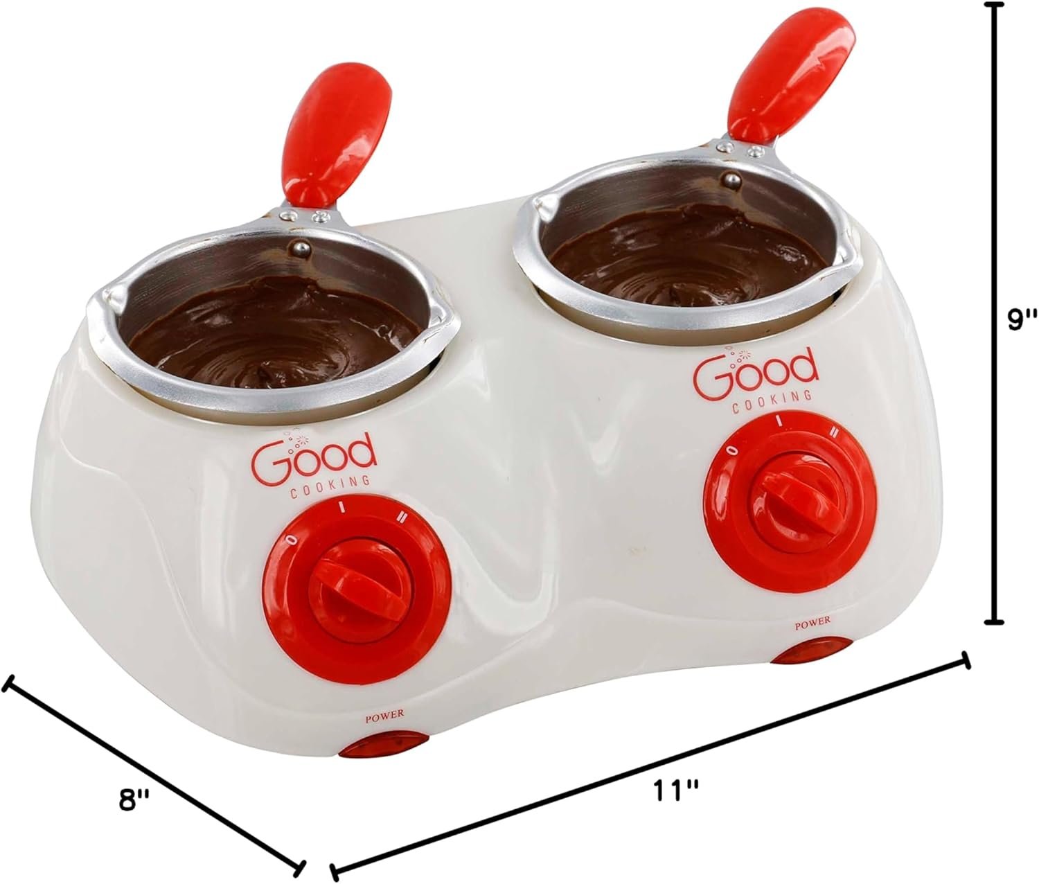 Deluxe Electric Dual Chocolate Melting Pots by Good Cooking- Perfect for melting, drizzling, and dipping your favorite chocolate, our chocolate melting pots come with over 30 accessories and 12 recipes so your favorite treats taste even better. Melt up to 2 cups of chocolate at a time without water, and use the fruit skewers, fondue forks, spatula, handling fork, truffle dipper, and metal cooling rack to perfect your favorite delicious snacks. With 9 unique molding trays included, you can get creative with your treats as well. Perfect for anyone who loves chocolate or trying new delicious snacks!