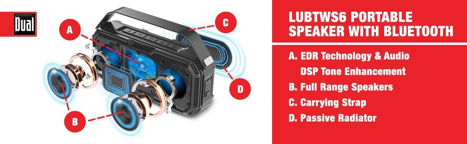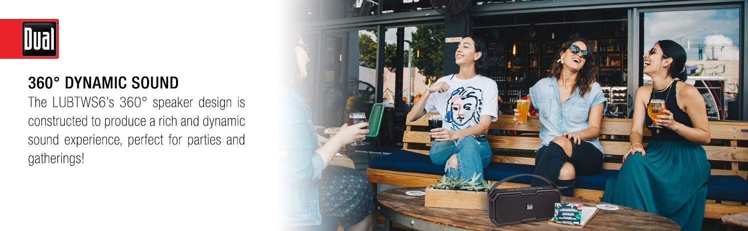 Dual Electronics Lubtws6 wireless portable Bluetooth speaker | Wireless Bluetooth stereo | Waterproof & Dustproof IP67 | 360 rich dynamic sound | 100ft wireless range | 15 Hour playtime | quick Charge will make a great addition to your home and outdoor space. Your portable and light-weight Bluetooth speaker will fill any open space with breathtaking sound, provides outdoor entertainment by the patio or pool, Makes a great companion on the go or in the garage. The advanced built-in technology allows you to listen to one of your dual Bluetooth speakers or have them paired via their TruWireless setting for amazing amplified music without the hassle of connecting them via wires. backed by our 1 Year that s a hassle-free experience with excellent customer service.
