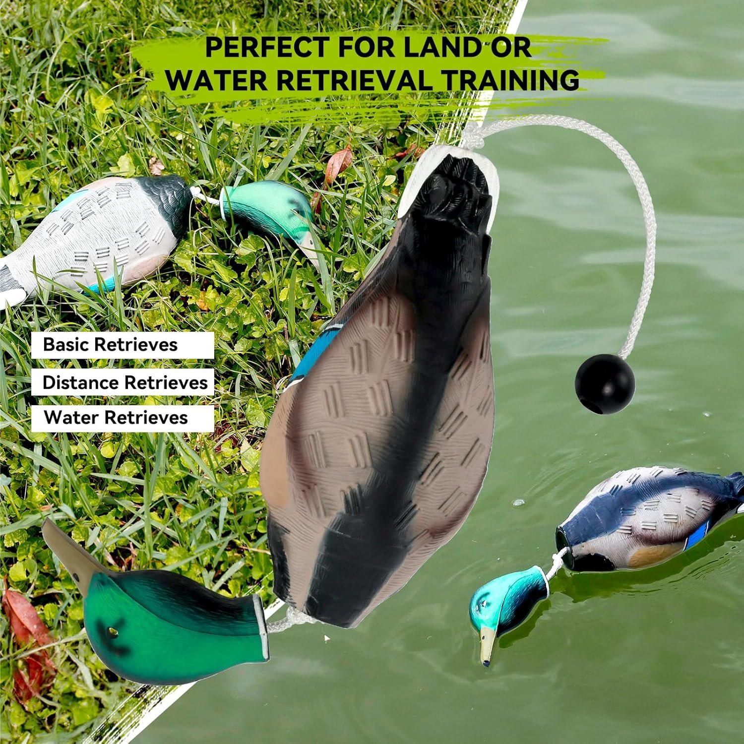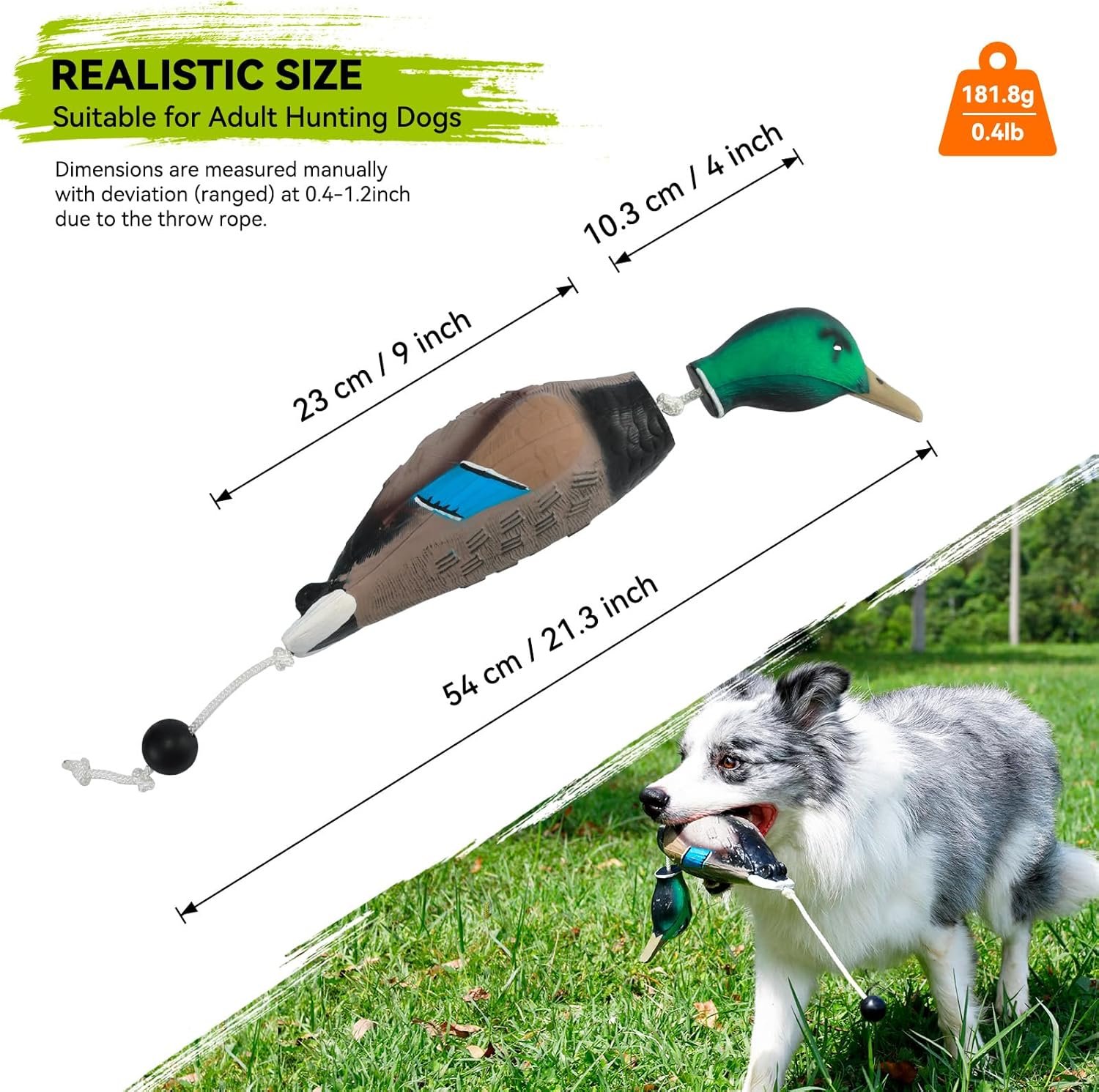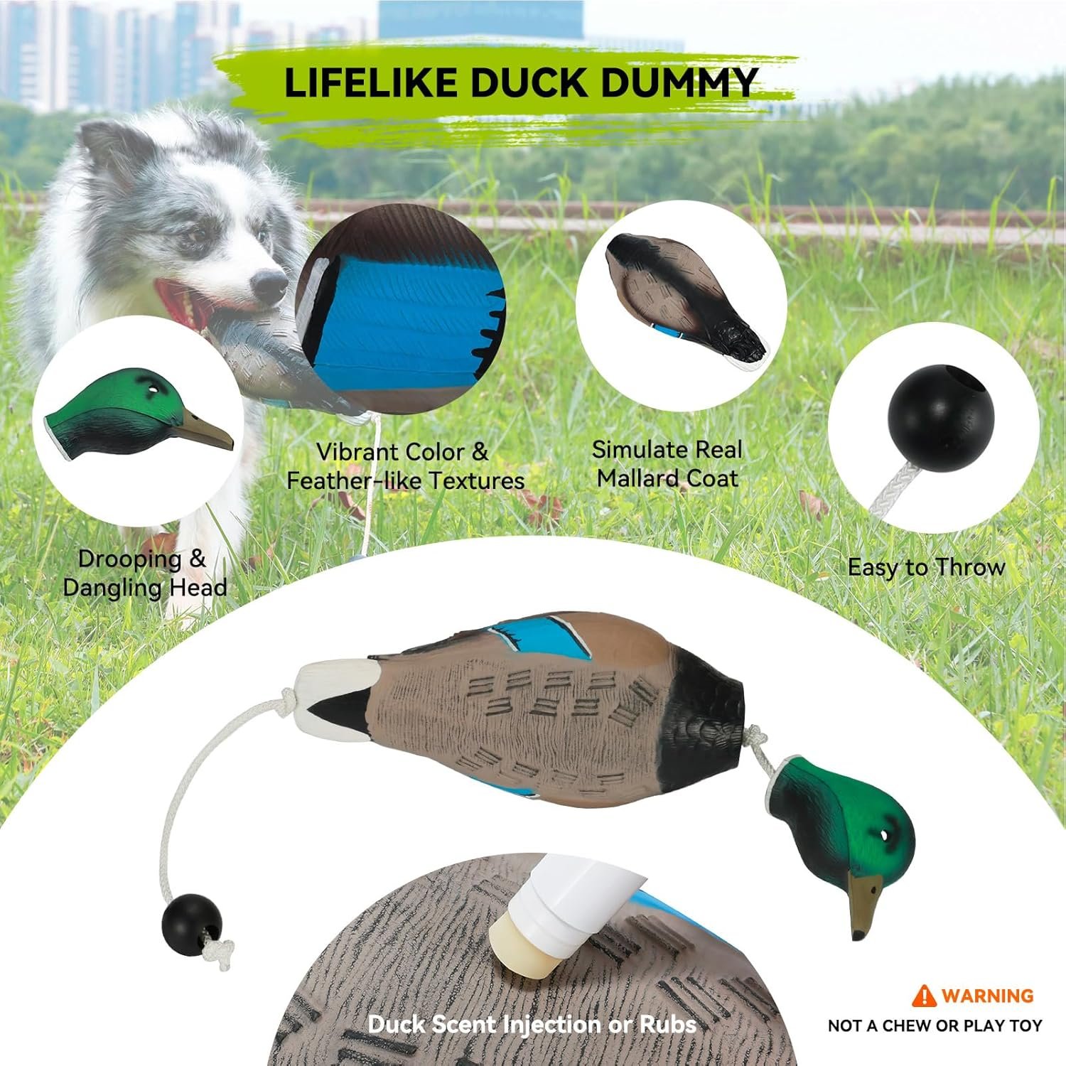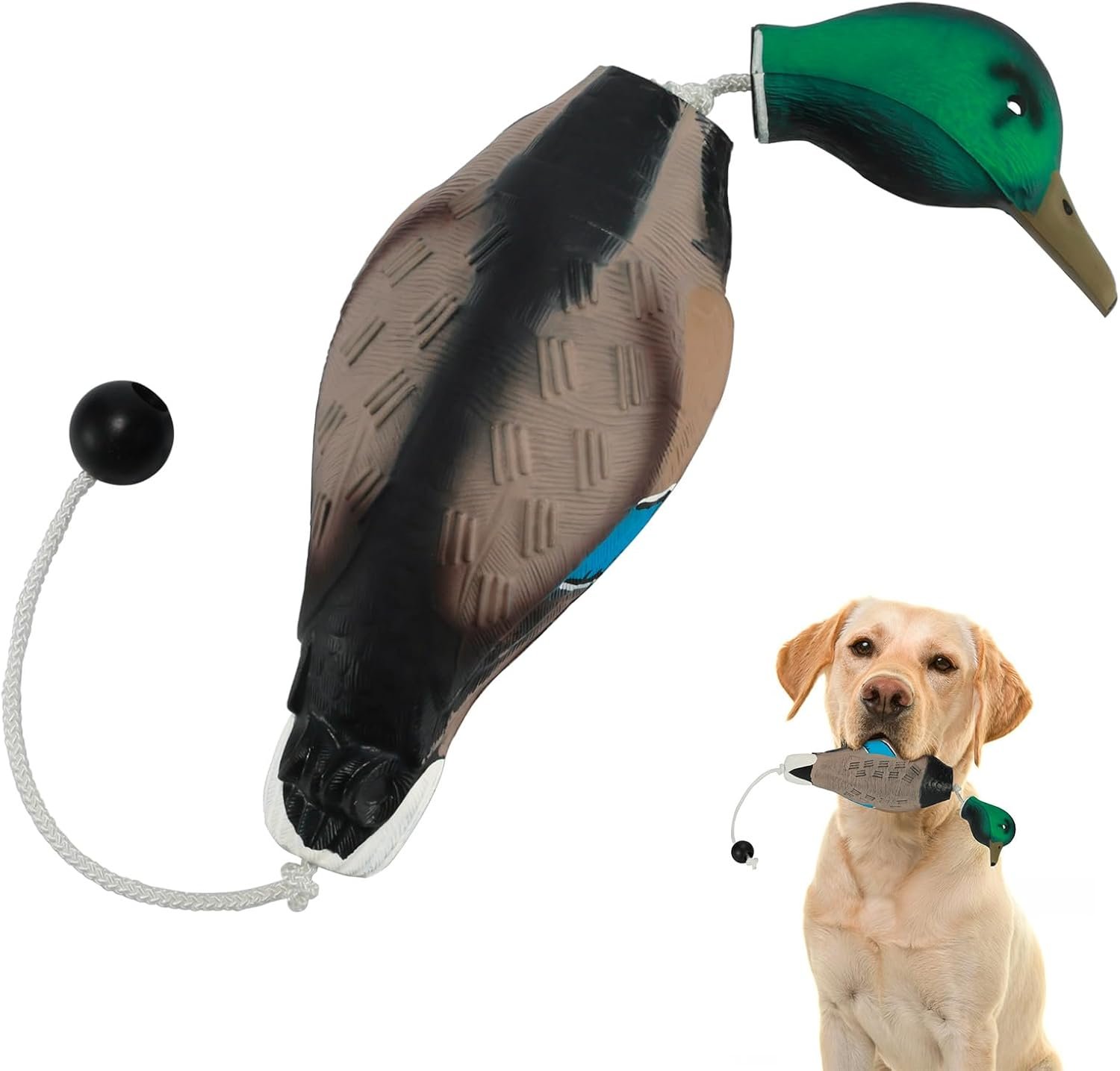 LIFELIKE DUCK DUMMY: Features a vivid exterior design, complete with a dangling head that perfectly replicates a dead duck falling from the air. This realistic simulation aids your hound in acclimating to the sensation of handling game in its mouth. Sized similarly to a smaller mallard, boast a textured body and vibrant colors, further enhancing its lifelike appeal. Add some duck scent, and your dog won’t be able to tell the difference. Dimensions: 4.2 x 6.0 x 3.6 inches. Weight: 0.4lb.