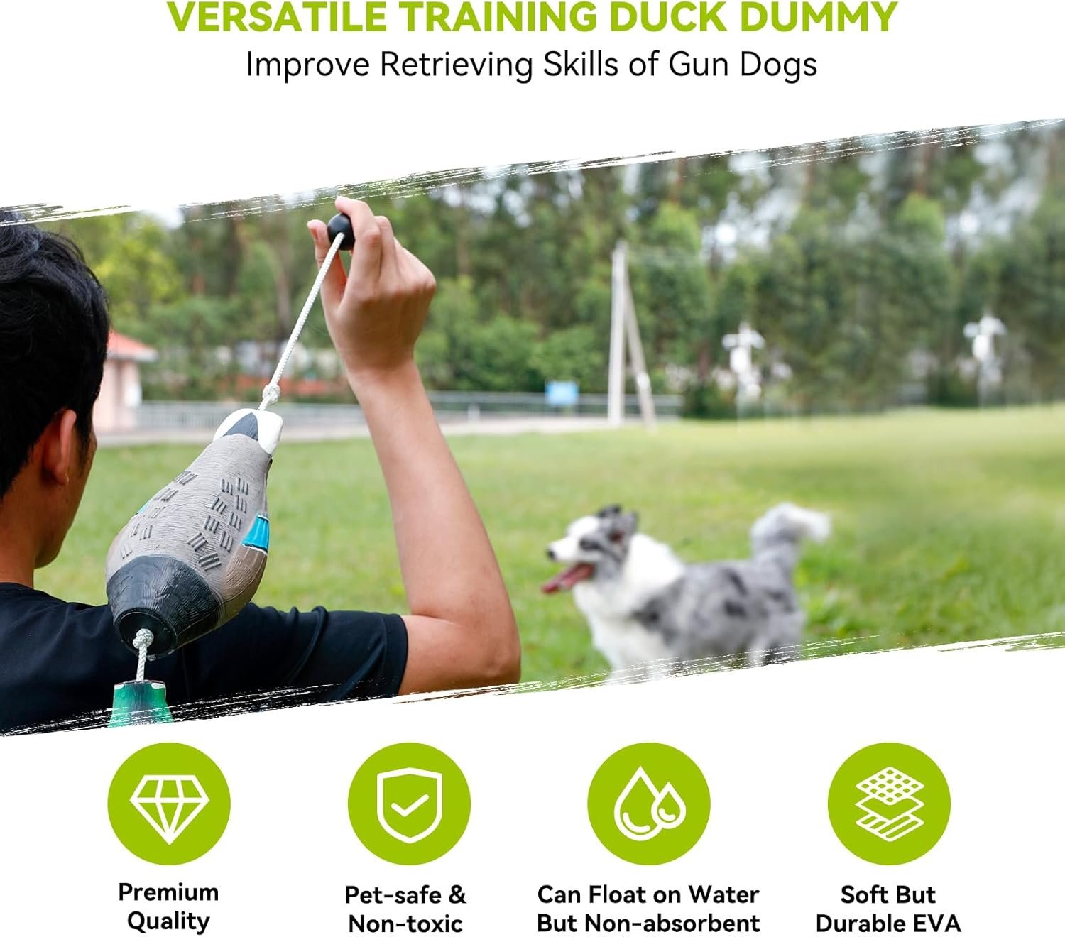 STURDY & DURABLE: Crafted from resilient EVA material and nylon throw rope, GearOZ duck dummy is both sturdy and soft. Ensuring pet safety, it is non-toxic and environmentally friendly, safeguarding your hound dog’s teeth while enduring the rigors of daily retriever training. The ribbed design on the body enhances grip, facilitating easy grabs and holds during retrieves. It can not only promotes proper gripping technique but also strengthens your dog’s retrieving skills.