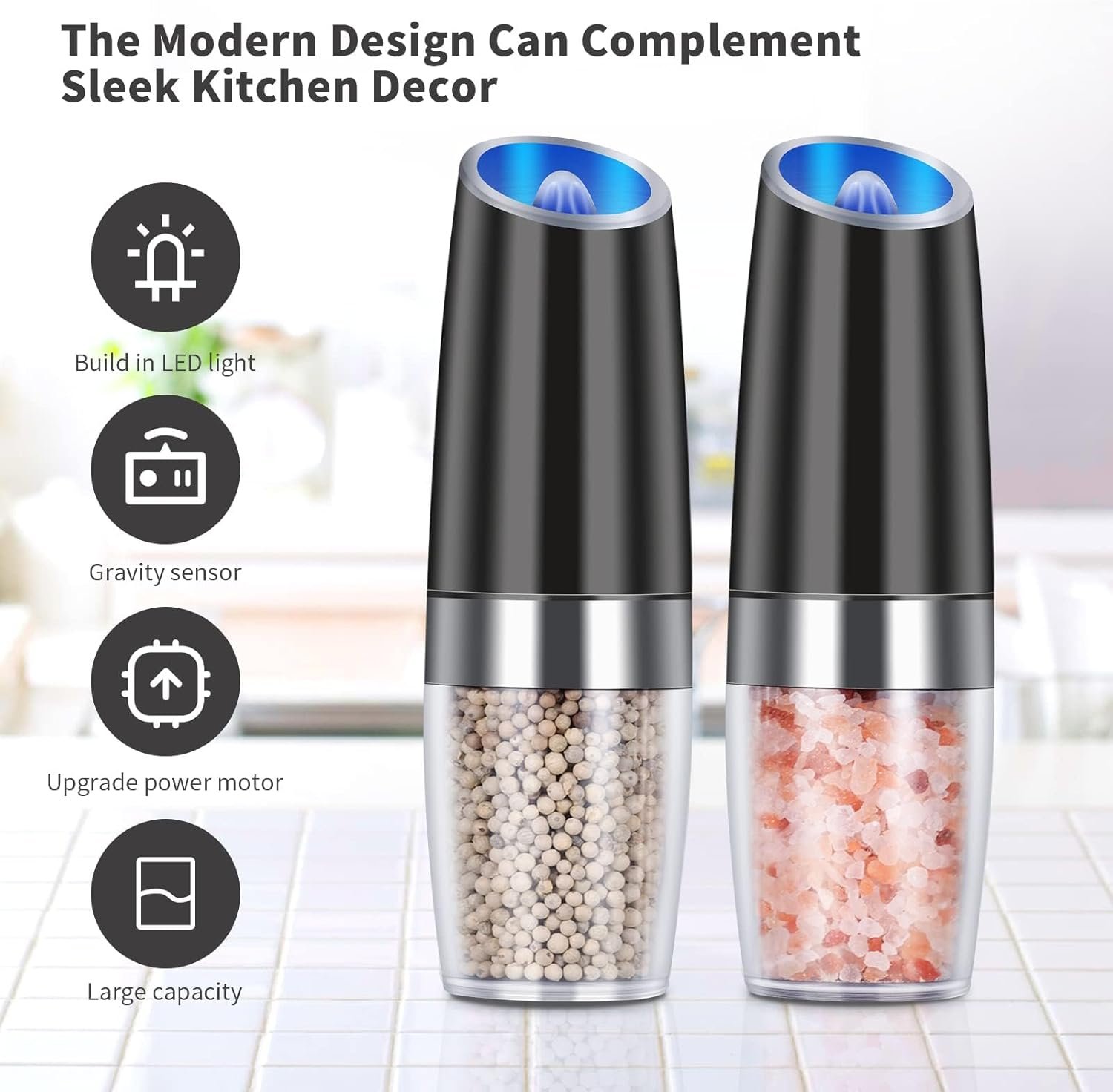 [MODERN DESIGN]: The Modern Electric Salt and Pepper Grinder Set features a sleek and stylish design, perfect for modern kitchens. Upgrade your cooking and entertaining experience with this innovative and visually appealing grinder set.